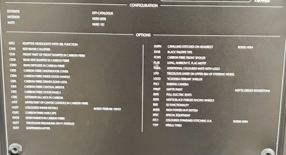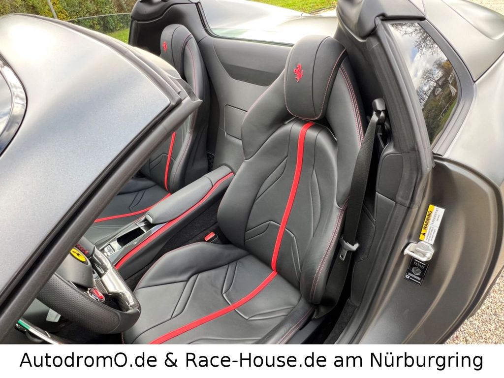 Zur umfangreichen Ausstattung gehören Adaptive Scheinwerfer mit SBL Funktion, rote Bremssättel, Carbon Frontstange, Carbon Diffusor, Carbon Seitendiffusor, Carbon Driver Zone, Carbon Mitteltunnel, Carbon Einstiegsleisten, Carbon Center Konsole, Carbon Nabendeckel, vollelektrische Sitze mit Cavallino Wappen auf den Kopfstützen, Liftsystem, Scuderia Ferrari Embleme, Parkkamera, High-Power Hifi System usw.