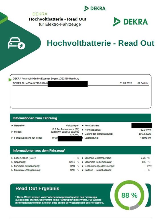 Wir verkaufen unseren treuen ID.3. weil wir aufs Fahrrad umgestiegen sind.DEKRA Batterietest durchgeführt am 31.03.2026 SoH: 88 %