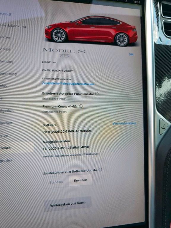 Verkaufe wegen Umstellung auf Model Y mein Tesla Model S 75 in Rot 330PS mit Volllederausstattung, Glas/Schiebedach, Ultra High Fidelity Soundanlage 11 Lautsprecher + Bassbox im Kofferraum, MCU1, CCS Update, 19" Aluminium Felgen mit Winterreifen (5mm), Carbon Interieur Leisten Innenraum, Fussmatten Premium Rot , LED Scheinwerfer, Typ2 Ladekabel + Ladeadapter CCS Schnellladen mit bis zu 130KW.Vor kurzem wurde die 12V Batterien erneuert, der PDC Innenraumheizer ist Neu, TÜV ist neu, neue Frontscheibe , AKKU SOC 84% 320KM Reichweite bei 100% 260KM bei 80%. Über 80% nur über AC schonend geladen.
