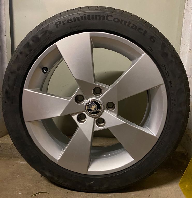 Sommer: Felgen Skoda Original 17“ Leichtmetallfelgen Denom & Continental Reifen Premium Contact 6 bzw. 7 mit 5 mm Restprofil vorne und 6 mm Restprofil hinten