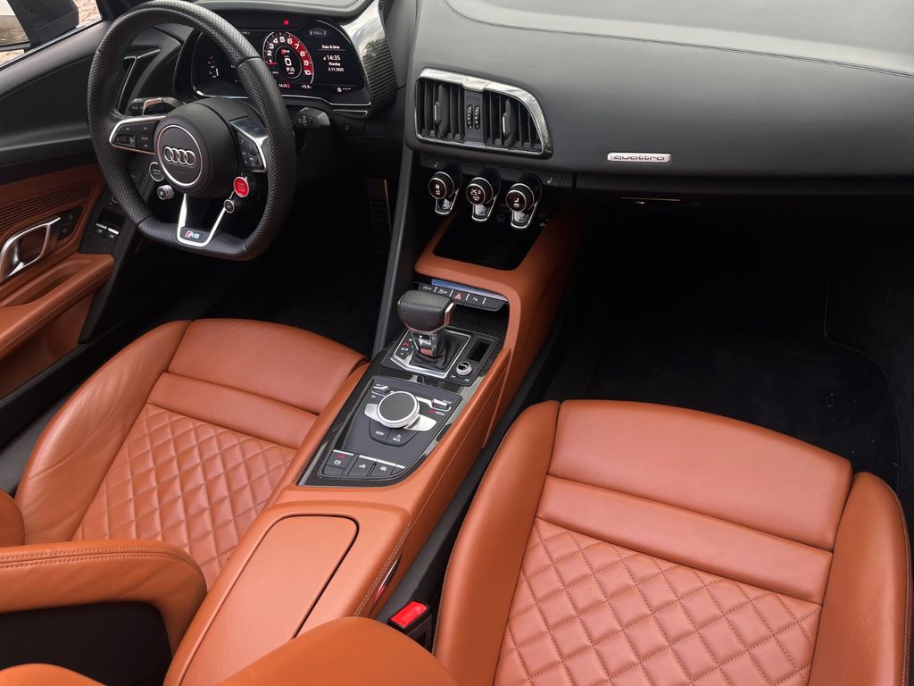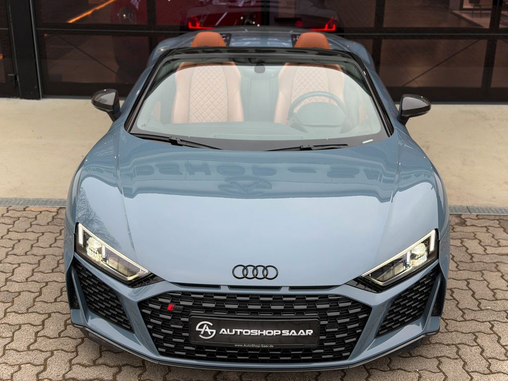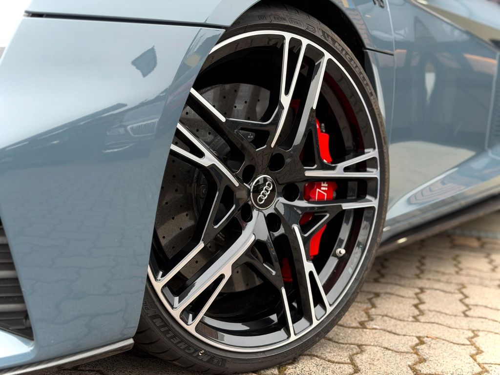 Sonderausstattung:Fahrwerk mit Dämpferregelung (Magnetic Ride) mit CFK-Stabilisator vorn, Innenausstattung: Voll-Leder Feinnappa, Keramik-Bremsanlage vorn und hinten, Bremssättel Rot lackiert, LM-Felgen vorn/hinten: 8,5x20 / 11x20 (5-Doppelspeichen, Dynamik-Design, Anthrazit-Schwarz glänzend, glanzgedreht), Metallic-Lackierung, Optik-Paket schwarz Audi Ringe und Schriftzug erweitert Audi exclusive, R8 Sportsitze Leder Feinnappa mit Rautensteppung, Technologie-Paket