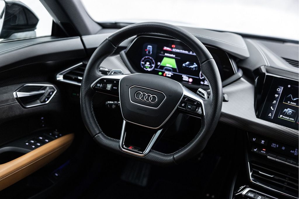Ein E-Tron GT RS verfügt über 600 PS, Allradantrieb und Hinterachslenkung. Dieses Exemplar ist in wunderschönem Kemoragrau Metallic lackiert und verfügt über eine Audi Exclusive Cognacbraun-Innenausstattung mit Carbonfaser-Verzierungen!