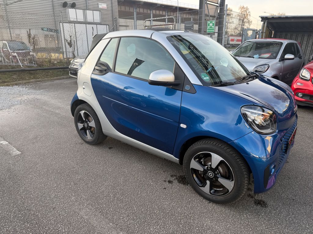 Entdecken Sie diesen gepflegten Smart ForTwo Cabrio mit Elektroantrieb aus dem Jahr 2021. Das Fahrzeug überzeugt durch seinen umweltfreundlichen Elektroantrieb mit 82 PS und Heckantrieb. Mit nur einem Vorbesitzer und lückenloser Servicehistorie präsentiert sich dieser Smart in einem ausgezeichneten Zustand. Die metallicblaue Außenlackierung harmoniert perfekt mit dem schwarzen Stoffinterieur. Die Automatikschaltung sorgt für komfortables Fahren im Stadtverkehr. Dank des Cabriocharakters genießen Sie bei schönem Wetter das Fahrgefühl unter freiem Himmel.Die Ausstattung umfasst zahlreiche Komfort- und Sicherheitsmerkmale wie Automatikklima, beheizbare Sitze, Lenkradheizung und LED-Scheinwerfer. Parksensoren hinten und eine Rückfahrkamera erleichtern das Einparken. Das Fahrzeug verfügt über ein Touchscreen-Infotainmentsystem mit DAB-Radio, Bluetooth und USB-Anschluss.