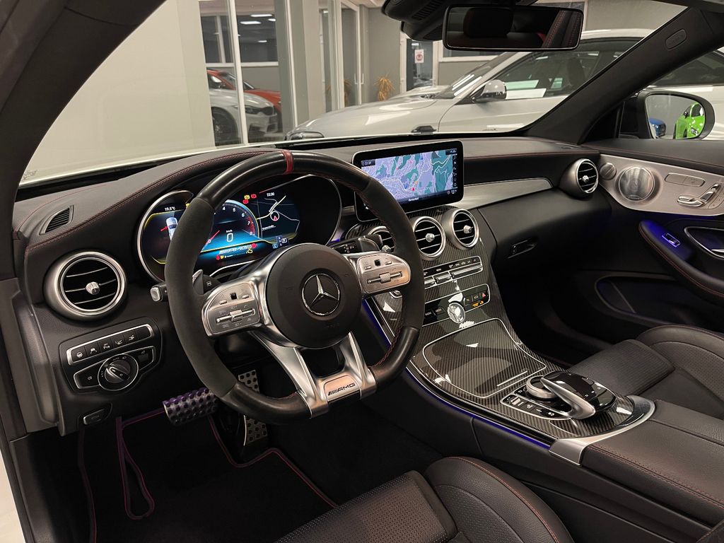 Ablage-Paket, Ambiente-Beleuchtung, Digitales Instrumenten-Display, Fahrassistenz-Paket High-End, Fahrassistenz-System: Verkehrszeichenerkennung, Gurtbringer, Head-up-Display (Frontsichtanzeige), Infotainment-Paket High-End, Innenausstattung: Zierteile Carbon (AMG), Komfort-Paket Advanced, Lenkrad (AMG Performance, Nappa / Dinamica), Licht-Paket High-End, LM-Felgen vorn/hinten: 7,5x19 / 8,5x19 (AMG, Vielspeichen, mattschwarz, Felgenhorn glanzgedreht), Media Interface (Universal-Schnittstelle für iPod / AUX / USB / MP3), Night-Paket, Panorama-Schiebedach, Park-Paket High-End, Reifen-Reparaturset (Tirefit), Scheibenwaschanlage beheizt, Sitzbezug / Polsterung: Leder, Sonderlackierung Diamant-Weiß Bright (designo-Lack), Sport-Auspuffanlage (AMG Performance), Sportsitze AMG Performance, Surround-System Burmester, Vorrüstung Mobiltelefon/Handy / Komfort-Telefonie / LTE-fähig