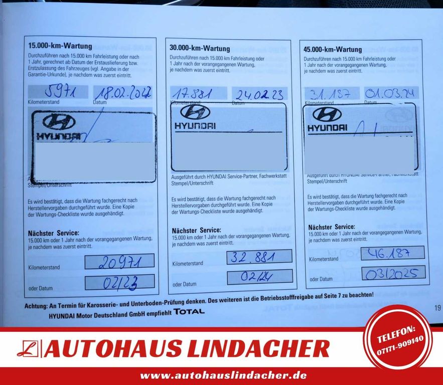 Alle bisherigen Wartungen wurden regelmäßig beim Hyundai-Vertragshändler durchgeführt. Zuletzt im April 2025 bei 40.074KM. Scheckheftgepflegt.