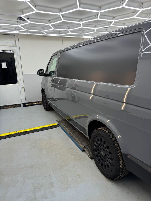 Ich habe den T6 bei VW foliieren lassen mit einer matten Folie, einen Sonnenblendenstreifen hat er auch bekommen, die VW Logos vorne und hinten wurden schwarz foliert und die hintern Scheiben habe ich auch gleich tönen lassen.