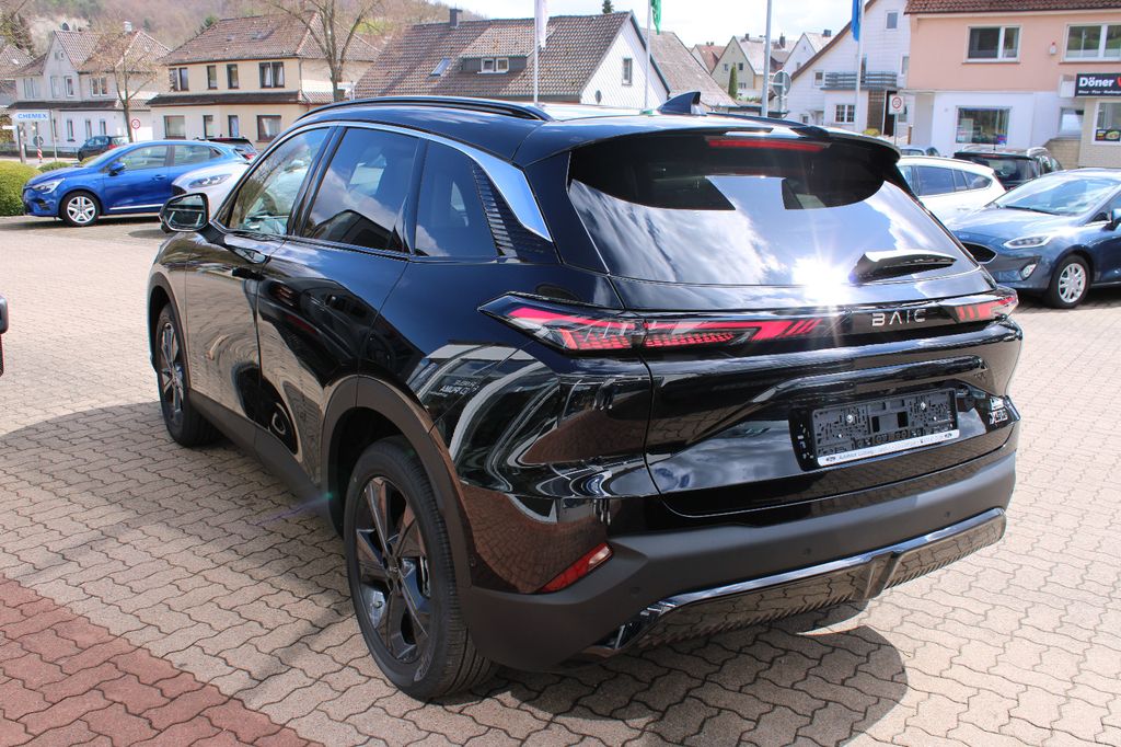 Der neue BAIC Beijing X55 bietet ein beeindruckendes Gesamtpaket für anspruchsvolle SUV-Fahrer. Dieses Frontantrieb-Modell wird von einem 1.498 ccm Benzinmotor mit 177 PS angetrieben und erfüllt die Euro 6 Abgasnorm. Die Automatikschaltung sorgt für komfortables Fahren, während zahlreiche Assistenzsysteme wie Spurhalteassistent, Kollisionsvermeidung und Verkehrszeichenerkennung für Sicherheit sorgen. Das Interieur überzeugt mit schwarzer Lederausstattung, beheizbaren Sitzen, Massagefunktion und einem beheizbaren Lenkrad. Das Panorama-Glasdach und die Ambientbeleuchtung schaffen eine angenehme Atmosphäre.Die 360-Grad-Kamera und Parksensoren vorne und hinten erleichtern das Rangieren. Für Unterhaltung und Konnektivität sorgen Apple CarPlay, Android Auto, Bluetooth, DAB-Radio und kabelloses Laden. Die LED-Scheinwerfer mit Fernlichtassistent und die schwarze Metallic-Lackierung unterstreichen den sportlichen Charakter dieses SUVs.