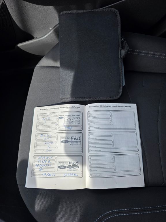 Fahrzeug steht auf fast neuwertigen Allwettereifen mit Stahlfelgen und original Ford Radkappen.