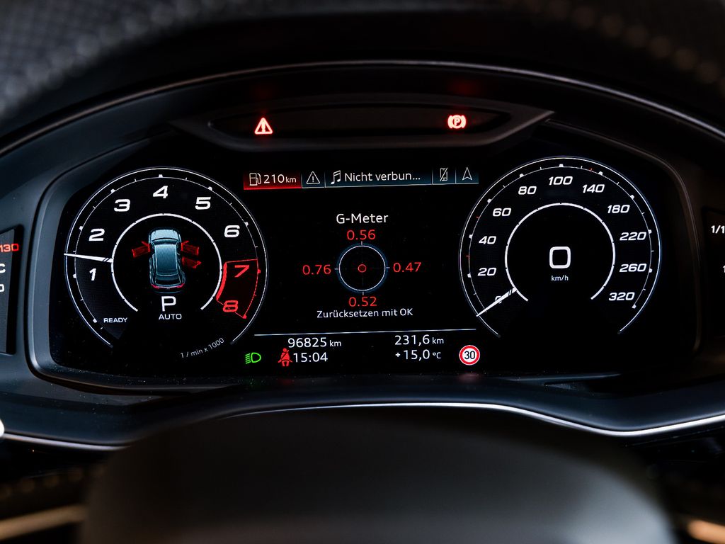 Sonderausstattung:Akustikglas Türscheiben seitlich, Assistenz-Paket Parken, Assistenz-Paket Stadt, Assistenz-Paket Tour, Audi music interface im Fond, Audi Smartphone Interface, Außenspiegel elektr. verstell-, heiz- und anklappbar, mit Abblendautomatik und Memory, Bluetooth-Freisprecheinrichtung mit Spracherkennung (Audi Phone Box), Dachhimmel Alcantara schwarz, Diebstahlsicherung für Räder (Felgenschlösser), DVD-Laufwerk, Dynamik-Paket plus, Frontscheibe Klimakomfort / Akustikglas, heizbar, Head-up-Display, Innenausstattung: Dekoreinlagen Carbon Köper, Innenausstattung: erweiterte Interieurelemente in Leder, Isofix-Aufnahmen für Kindersitz an Beifahrersitz, LM-Felgen 10,5x23 (5-Y-Speichen, Rotor-Design, Anthrazit-Schwarz, glanzgedreht), Matrix-LED-Scheinwerfer, Metallic-Lackierung, Optik-Paket Aluminium matt, RS-Sportabgasanlage, Seitenairbag hinten, Sender für Garagentoröffner (integriert), Servoschliessung für Türen, Sitzbelüftung und Massagefunktion vorn, Sitzbezug / Polsterung: Leder Valcona perforiert, Wabensteppung, belüftet), Sonnenschutzrollo an Heckscheibe mech. und Seitenscheiben hinten elektr., Sound-System Bang & Olufsen, Standheizung, Stoßfänger RS-Version, Voll-Lackierung, Verglasung hinten abgedunkelt (Privacyverglasung)