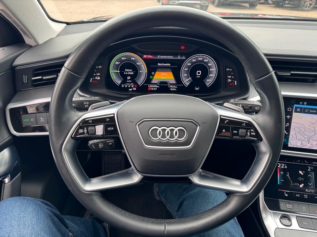 Dieser gepflegte Audi A6 Kombi aus dem Jahr 2022 präsentiert sich in elegantem Schwarz mit nur einem Vorbesitzer und lückenloser Servicehistorie. Der Hybrid-Antrieb mit 299 PS und Allradantrieb bietet sowohl Leistung als auch Effizienz nach Euro 6d-Standard.