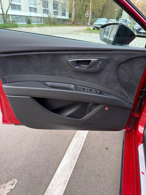 Die Ausstattung lässt keine Wünsche offen: Sportsitze, Schiebedach, Beats Audio Soundsystem, Apple CarPlay, ACC (Abstandsregeltempomat) sowie diverse Assistenzsysteme sind vorhanden. Der Innenraum wurde zusätzlich veredelt durch eine neu bezogene Armlehne in Alcantara mit weißen Nähten und eingesticktem Cupra-Logo, perfekt abgestimmt auf das Gesamtbild.