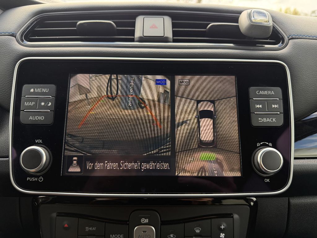 Weiteres: Reifendruck-Kontrollsystem, Sitzbezug / Polsterung: Stoff, Geschwindigkeits-Regelanlage (Tempomat), Rückfahrkamera, 360°-Kamera, Schließ-/Startsystem intelligent key, Heckleuchten LED, Ambiente-Beleuchtung, Leuchtweitenregelung, LM-Felgen, Audiosystem: Radio mit MP3-Wiedergabefunktion, Touchscreen-Farbdisplay (8,0 Zoll) in Mittelkonsole, Innenraumfilter: Pollenfilter, Scheibenwischer mit Regensensor, Anti-Blockier-System (ABS), Nebelscheinwerfer, Tagfahrlicht LED, Lenksäule (Lenkrad) höhenverstellbar, Start-Stop-Knopf, Wegfahrsperre (elektronisch), Automatische Fahrlichtschaltung, Kopf-Airbag-System, USB-Schnittstelle, Wärmeschutzverglasung mit UV-Schutz, AUX-IN-Anschluss (AUX-IN), Rücksitz geteilt/klappbar, Airbag Beifahrerseite, Airbag Fahrerseite, Außenspiegel elektr. verstellbar, Seitenairbag, 12V-Steckdose, aktiver Spurhalteassistent, mit korrigierendem Bremseingriff, Akustischer Umfeldschutz (Außensound), Audiobedienung am Lenkrad, Außenspiegel Wagenfarbe, Außentemperaturanzeige, Autom. Begleitfunktion der Beleuchtung (Follow me home), Autonomer Notbrems-Assistent, Berg-Anfahr-Assistent, Blinkleuchte in Außenspiegel integriert, Bluetooth-Schnittstelle, Bremsassistent (Nissan Brake-Assist), Elektr. Bremskraftverteilung (EBD), Fahrer-Informations-System (FIS) mit Farbdisplay, Fensterheber elektrisch vorn und hinten, Fernlichtassistent, Freisprechanlage Bluetooth, Frontkamera, Fußgängererkennung, Geschwindigkeits-Warnanlage akustisch (Speed-Limiter), Getränkehalter hinten, Getränkehalter in Mittelkonsole, Getränkehalter vorn, Gurtstraffer, Handschuhfach beleuchtet, Isofix-Aufnahmen für Kindersitz, Klimaautomatik, Kofferraumabdeckung, Ladevorrichtung Wechselstrom (bis 6,6 kW), Schnellladevorrichtung Gleichstrom (bis 50 kW), Lederlenkrad, Navigationssystem, Pedalerie elektr. einstellbar, Querverkehrs-Assistent Heck, Radioempfang Digital (DAB), Servolenkung elektronisch, Sitzhöhenverstellung Fahrersitz, Smartphone Schnittstelle, Spurhalteassistent, Totwinkel-Assistent, Verkehrszeichenerkennung, ZV mit Fernbedienung