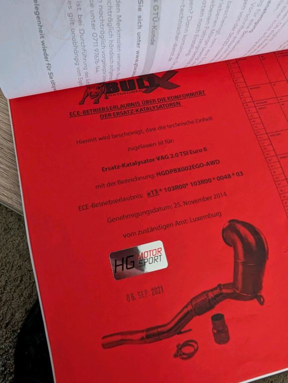 Danach habe ich alles beim TÜV eintragen lassen und es gab dort auch keinerlei Beanstandungen. Alle Unterlagen, TÜV Gutachten etc. sind natürlich vorhanden. Der Fahrzeugschein und -Brief wurde natürlich dementsprechend angepasst. Da der Wagen durch eine Leistungssteigerung lauter sein darf gibt es da auch keinerlei Probleme. Wir haben den Wagen gemessen und es ist auch noch Luft nach oben mit dem Stand- und Fahrgeräusch. Die Vorbereitungen für weitere Leistungssteigerungen sind somit auch gegeben und mit der Luft- und Abgasseite ist dafür eine sehr gute Grundlage vorhanden.