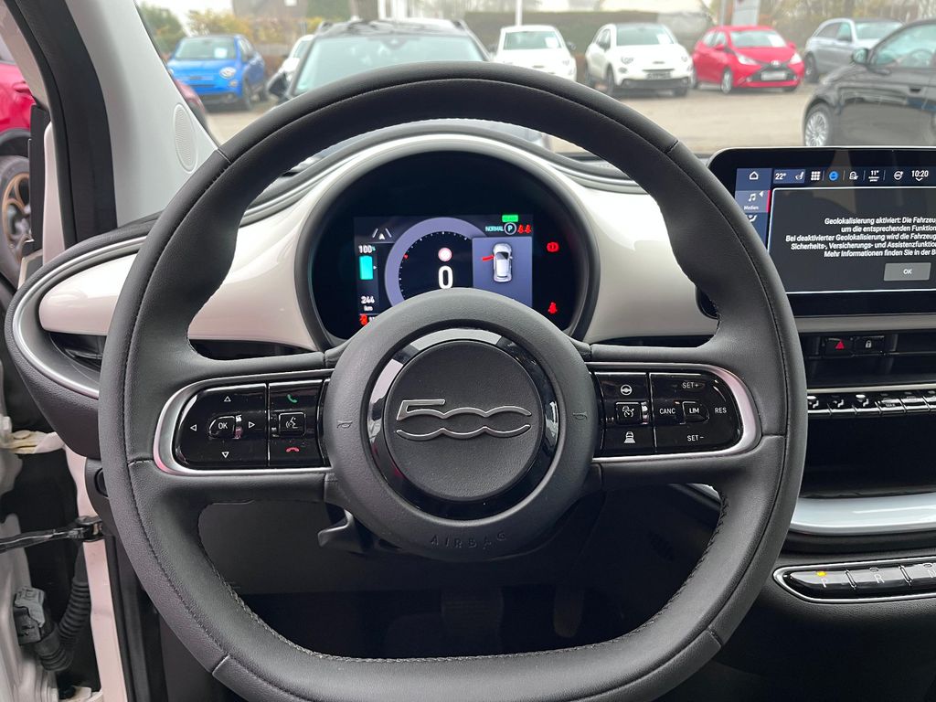 Airbag Fahrer-/Beifahrerseite, Ambiente-Beleuchtung, Antriebs-Schlupfregelung (ASR), Armaturenbrett farbig, Autom. Begleitfunktion der Beleuchtung (Follow me home), Außenspiegel mit Abdeckkappen schwarz, Beifahrerairbag abschaltbar, Einschaltautomatik für Fahrlicht / Lichtsensor, Elektromotor 87 kW (cont. 43 kW), Fahrassistenz-System: Aufmerksamkeits-Assistent, Fahrassistenz-System: Autonomer Notbrems-Assistent (AEB), Fahrassistenz-System: Bremsassistent, Fahrassistenz-System: Spurhalteassistent, Fahrassistenz-System: Verkehrszeichenerkennung, Fahrmodusschalter, Halterung Smartphone, Heckleuchten LED, Heckscheibe heizbar, HV-Batterie 42 kWh (Lithium-Ionen), Infotainment-System: UConnect 5 mit Navigationssystem, DAB+ und Bluetooth-Freisprecheinrichtung (Touchscreen 10,25"), Infotainment-System: UConnect mit DAB+ Radioempfang (Touchscreen 10,25"), Instrumentenanzeige Farbdisplay, 7 Zoll, Karosserie: 3-türig, Klimaautomatik, Kopf-Airbag-System vorn, Kopfstützen hinten, Ladekabel mit Schukostecker (Mode 2), Ladekabel mit Typ 2-Stecker (Mode 3), Lenkrad (Soft Touch) mit Multifunktion, Lenksäule (Lenkrad) höhenverstellbar, LM-Felgen, Memoryfunktion für Sitz vorn links, Mobile Online Dienste UConnect Live, Nebelschlussleuchte, Notrufsystem (eCall), One Pedal Drive (elektronisches Gaspedal), Parkbremse elektrisch, Radioempfang digital (DAB+), Rücksitz geteilt / klappbar, Scheinwerfer H4, Schnellladefunktion 85 kW (DC), Seitenairbag vorn, Seitenschutzleisten schwarz glänzend, Sitzbezug / Polsterung: Stoff, Sitzverstellung vorn rechts (4-fach), Smartphone Schnittstelle (Apple CarPlay & Android Auto), Sonnenblenden mit Spiegel (beleuchtet), Steckdose (12V-Anschluß) vorn, Tagfahrlicht LED, USB-Schnittstelle, Wärmeschutzverglasung