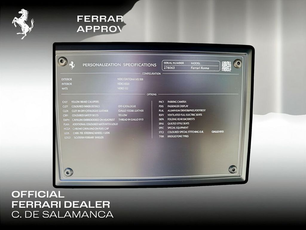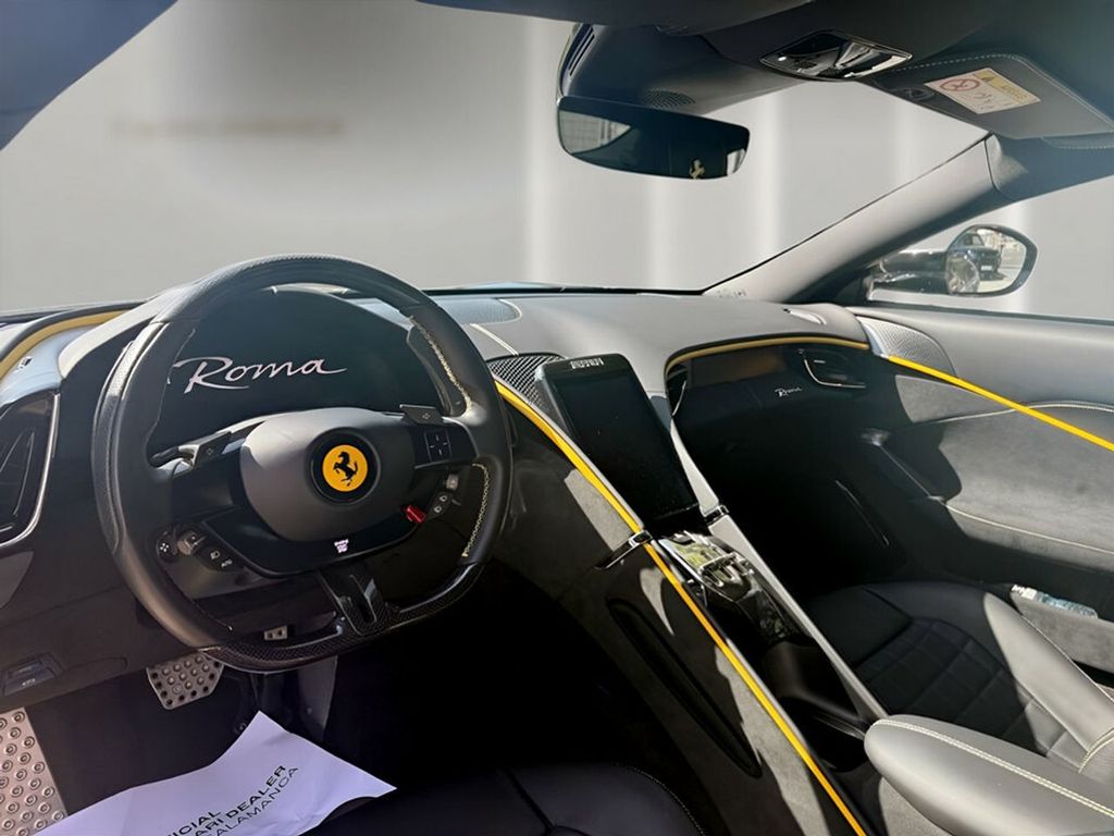 El Ferrari Ferrari Roma, el nuevo coupé 2+ con motor central delantero del Cavallino Rampante, presenta unas proporciones elegantes y un diseño atemporal a los que hay que sumar un rendimiento y manejo insuperables. Con su estilo y elegancia característicos, este vehículo constituye una representación contemporánea del despreocupado y placentero estilo de vida propio de la Roma de los años cincuenta y sesenta.SEATS ALCANTARA CENTRAL SEAT CENTRE PART OF SEAT IN COLOUR-MATCHED ALCANTARA® UPPER ZONE HEADLINER ALCANTARA® HEADLINER IN COLOUR OF CUSTOMER'S CHOICE 364709440 LOWER COCKPIT CARBON GLOSS FINISH CARBON FIBRE CENTRE TUNNEL ACCENTS MAIN AREA CARPETS CARPET COLOR 364900152 DASHBOARD CARBON GLOSS FINISH CARBON FIBRE DASHBOARD ACCENTS DETAILS STITCHING EMBROIDERED CAVALLINO EMBLEM ON HEADREST 364100326 LOWER COCKPIT DETAIL SOVERMATS WITH EMBROIDERED VEHICLE LOGO DASHBOARD CARBON CARBON STEERING WHEEL WITH LEDS DASHBOARD DETAILS PASSENGER DISPLAY LOWER COCKPIT DETAILS ALUMINIUM FOOTREST SEATS FUNCTIONALITY FULL-ELECTRIC VENTILATED FRONT SEATS SEATS COMFORT SEATS QUILTED STYLE SEATS DETAILS STITCHING STANDARD STITCHING IN COLOUR OF CUSTOMER'S CHOICE
