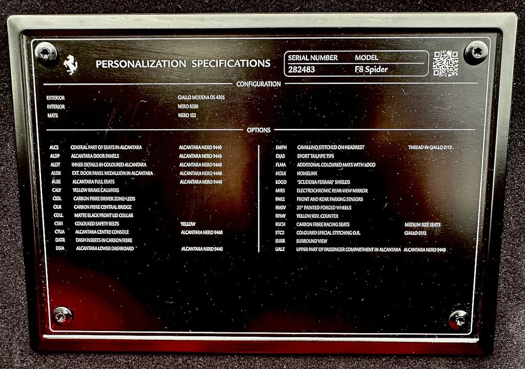Ein wunderschöner F8 Spider in der Traditionsfarbe Giallo Modena (Gelb) Komplett foliert mit Steinschlagschutzfolie! Der Eigentümer hat eine sehr umfangreiche Sonderausstattung bei Ferrari dazu bestellt! Rennsitze in Carbon! Sitzbezug komplett in Alcantara, Türverkleidungen komplett in Alcantara, Mitteltunnel in Alcantara, Armaturenbrett Oberteil und Unterteil komplett in Alcanatara, Dachhimmel in Alcantara, Innenraum in Alcantara, Fußmatten mit Logo in Gelb gestickt,Scuderia Logos an den Kotflügel, Sicherheitsgurte in Gelb, Cavallino (Pferd) gestickt in der Kopfstütze in Gelb, Kontrastnähte in gelb, Drehzahlmesser Gelb, Bremssättel in Gelb, Sportauspuffanlage schwarz, Parksensoren vorne und hinten, Surround view Kamera vorne und hinten, Homelink System, Innenspiegel automatisch abblendend, Carbon Lenkrad mit LED Schaltanzeige, Karbon Schaltwippen, Einsätze am Armaturenbrett in Carbon, Carbon Mitteltunnel Brücke, Schwarz Matte Front Einsätze,
