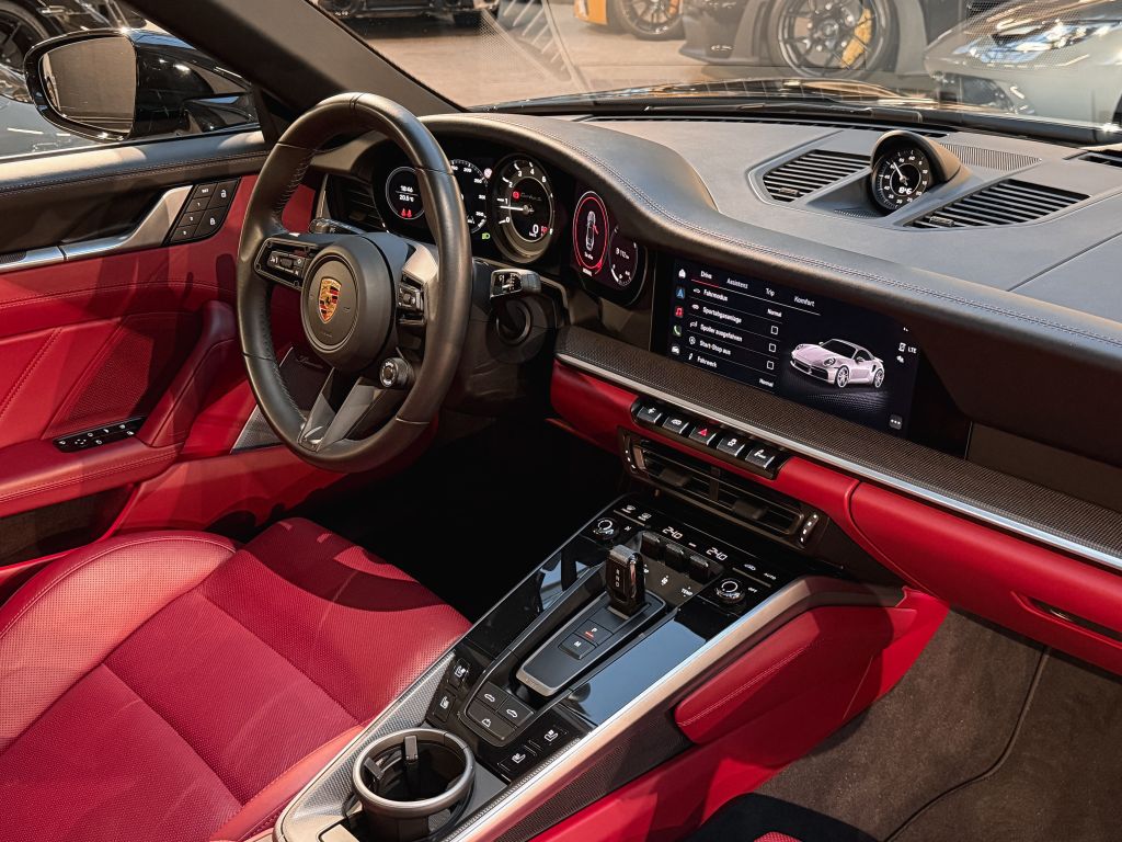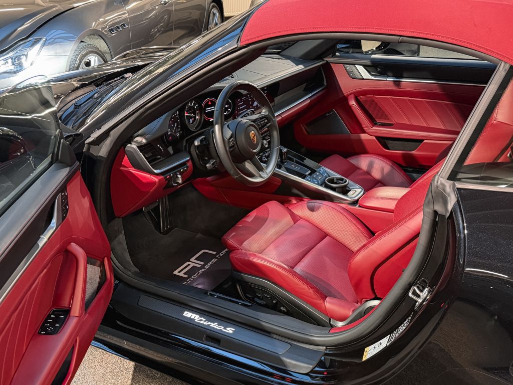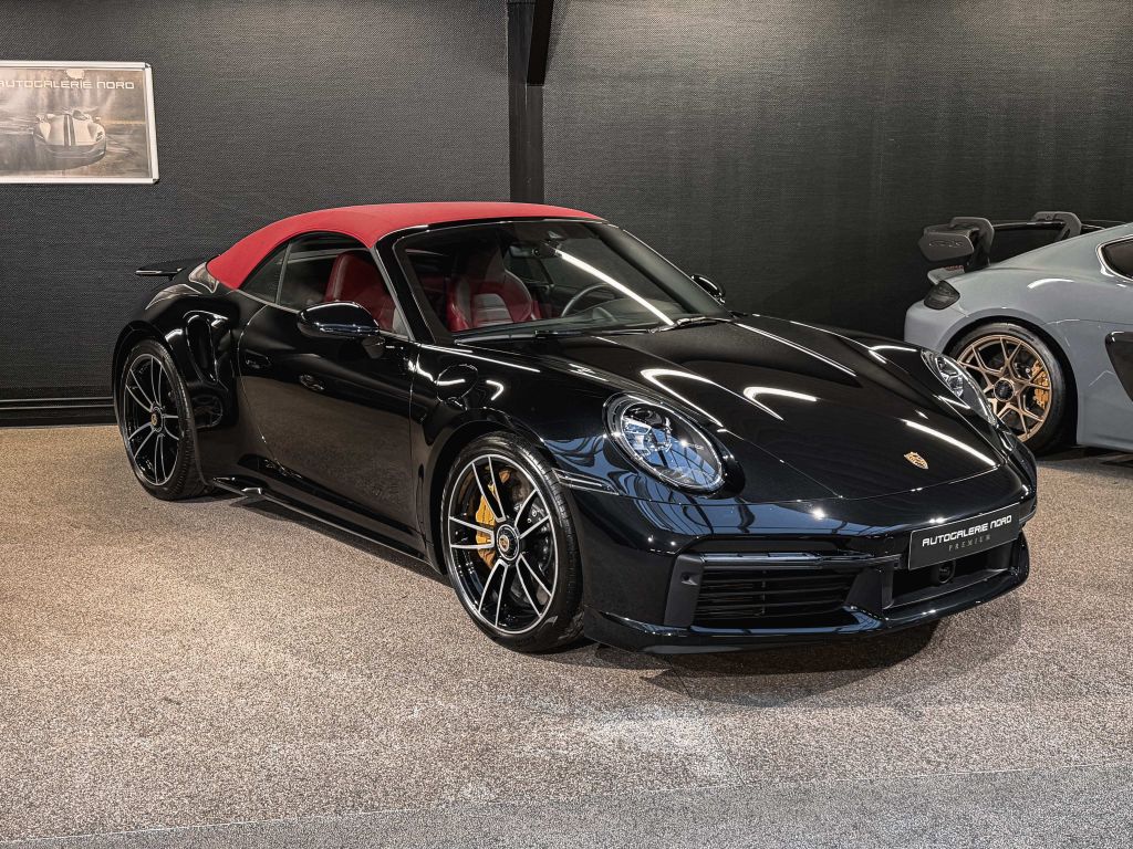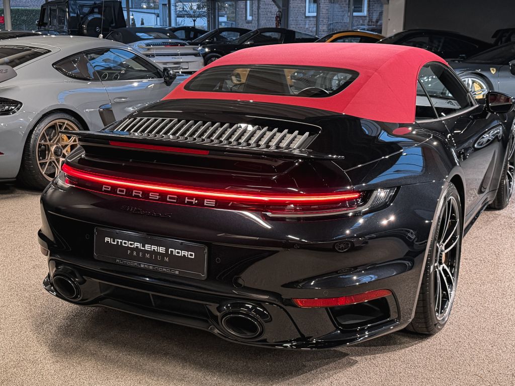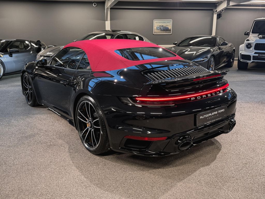 Zum Verkauf steht ein außergewöhnlicher Porsche 911 Turbo S Cabriolet in einer einzigartigen und geschmackvollen Konfiguration. Die Karosserie erstrahlt in schwarz metallic, kombiniert mit einem bordeauxroten Verdeck – eine Farbkombination, die Eleganz und Sportlichkeit perfekt vereint.