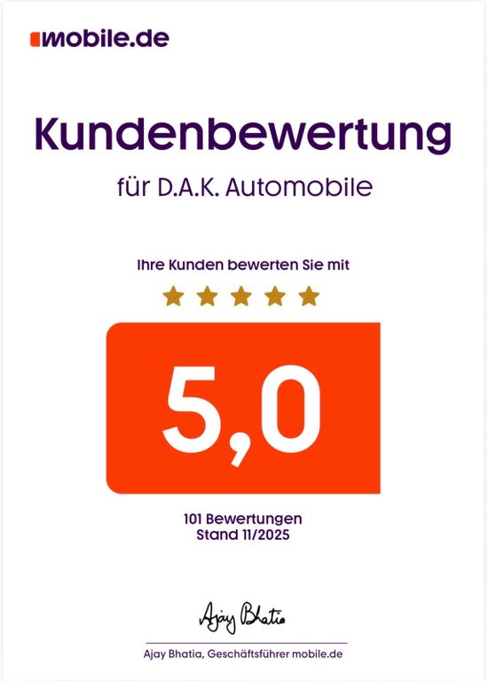 Wir kaufen gerne Ihr jetziges Fahrzeug an, d.h. die Inzahlungnahme Ihres Gebrauchten ist ebenso möglich wie die Vollfinanzierung ohne Anzahlung ab 3,99 % eff. Jahreszins. Eine Besichtigung und Probefahrt bitte nur nach telefonischer Terminvereinbarung. Irrtümer und Zwischenverkauf vorbehalten. Unsere Mitarbeiter beraten Sie gerne in Deutsch & Englisch. Mehr Infos auch außerhalb der Öffnungszeiten unter 0172 / 6966183.