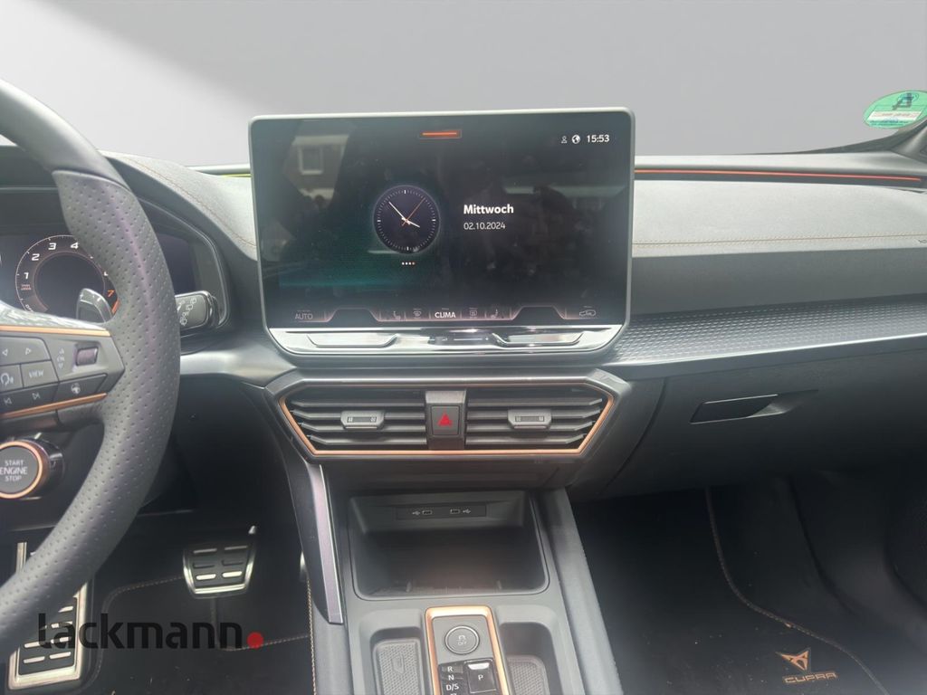 - Weiteres: Antriebs-Schlupfregelung (ASR), Getriebe 6-Gang, Sitzbezug / Polsterung: Stoff, Isofix-Aufnahmen für Kindersitz an Rücksitz, Rücksitzlehne geteilt/klappbar (1/3-2/3), Parkbremse elektrisch, Notrufsystem, LM-Felgen, Rücksitzlehnen umklappbar mit Fernentriegelung im Kofferraum, Schadstoffarm nach Abgasnorm Euro 6d, USB-Schnittstelle vorn (2-fach, Typ C), Fensterheber elektrisch vorn + hinten mit Komfortschaltung, Kombiinstrument digital (virtual cockpit), Nebelscheinwerfer LED mit Abbiegelicht, Seitenairbag vorn mitte (Central Airbag), Schließ-/Startsystem Kessy Advanced, Seitenscheiben hinten und Heckscheibe abgedunkelt, Rückfahrkamera, Heckklappe/-Deckel elektr. betätigt (öffnen + schliessen, sensorgesteuert), Außenspiegel elektr. verstell-, heiz- und anklappbar, Spiegelabsenkung, Welcome Light, Memory, Sitz vorn links elektr. verstellbar (mit Memory), Matrix-LED-Scheinwerfer, Reserverad als Notrad, ConstructionTimeMapping, Anti-Blockier-System (ABS), Wegfahrsperre (elektronisch), Kopf-Airbag-System, Gepäckraumabdeckung / Rollo, Licht- und Regensensor, Reifenkontroll-Anzeige, Seitenairbag, Airbag Fahrer-/Beifahrerseite, Heckleuchten LED mit dynamischem Blinklicht, Mittelkonsole vorn mit Mittelarmlehne, Becherhalter, Ablagebox und Luftausströmer hinten, Dachreling schwarz, hochglänzend, Heckleuchten Voll-LED mit dynamischem Lichtband (Infinite Light), USB-Ladeanschlüsse (2-fach, Typ C) für 2.Sitzreihe, Metallic-Lackierung, Adaptive Fahrwerksregelung (DCC), Antriebsart: Frontantrieb, Audiosystem mit Touchscreen-Farbdisplay, Automatische Distanzregelung (ACC), Beifahrerairbag abschaltbar, Blinkleuchten LED in Außenspiegel integriert, Bluetooth-Schnittstelle mit Freisprecheinrichtung, Climatronic 3-Zonen, Diebstahl-Warnanlage mit Innenraumüberwachung und Abschleppschutz, Einstiegsleisten (Aluminium) vorn, beleuchtet, Elektron. Differentialsperre (XDS), Elektron. Stabilitätskontrolle (ESC), Fahrprofilauswahl (CUPRA Drive Profile), Fernlichtassistent, Frontkamera, Innenspiegel mit Abblendautomatik, Laderaumboden variabel, Lendenwirbelstütze elektr. verstellbar, Licht- und Sicht-Paket, Lichtassistent (Coming Home, Leaving Home), Media-System Plus, Mittelarmlehne hinten, Motor 1,5 Ltr. - 110 kW 16V TSI ACT, Müdigkeitserkennung, Radioempfang digital (DAB+), Servolenkung elektro-mechanisch, Sitzheizung vorn, Sitzhöhenverstellung, Sitzhöhenverstellung Fahrersitz, Sport-Schalensitze vorn, Spurhalteassistent, Start/Stop-Anlage, Umfeldbeobachtungssystem (Front assist) mit City-Notbremsfunktion, Wärmeschutzverglasung, Winter-Paket, ZV mit Fernbedienung