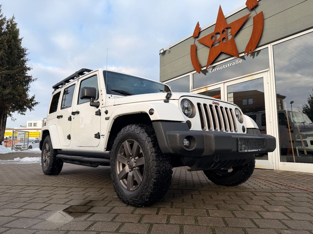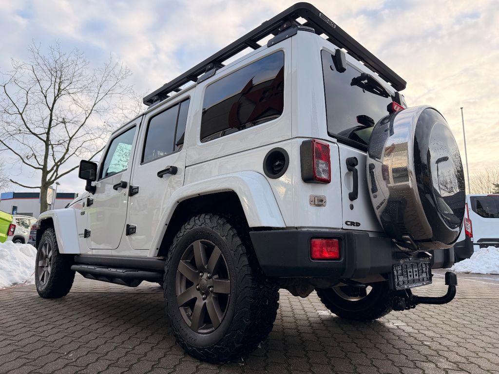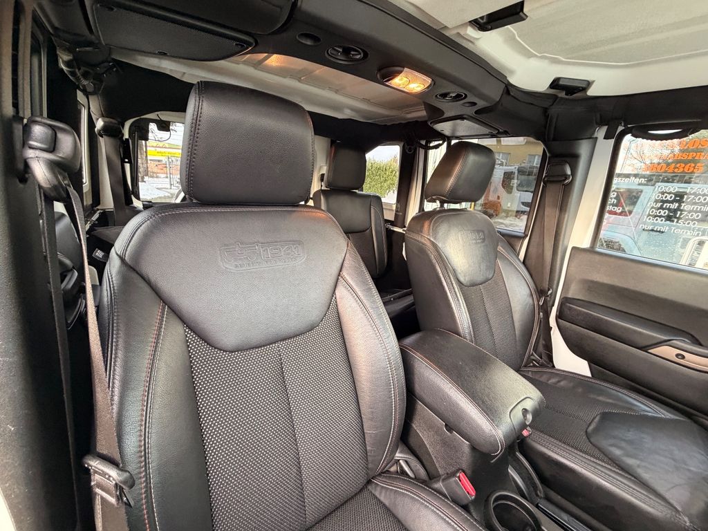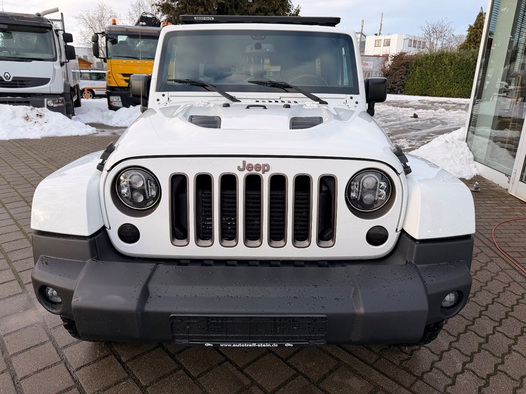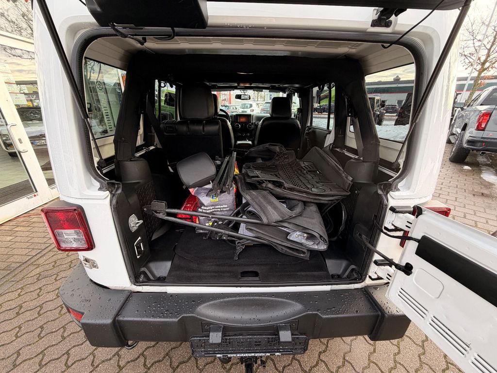 Weitere Ausstattung:75th Anniversary, Airbag Fahrer-/Beifahrerseite, Antriebs-Schlupfregelung (ASR), Audio-Navigationssystem: UConnect Multimedia-System mit Navigationssystem, Audiobedienung am Lenkrad, Automatische Fahrlichtschaltung / Lichtsensor, Außenspiegel heizbar, Bremsassistent, Dual-Top (Hardtop Wagenfarbe und Softtop), Freisprechanlage UConnect (mit Bluetooth-Schnittstelle), Fußmatten mit Reifenprofilstruktur (Mopar), Info-Center (EVIC), Innenspiegel mit Abblendautomatik, Karosserie: 4-türig, Klimaautomatik, Kotflügelverbreiterung in Wagenfarbe, Lenkrad mit Multifunktion, Lenksäule (Lenkrad) höhenverstellbar, LM-Felgen, Motor 2,8 Ltr. - 147 kW CRD KAT, Motorhaube mit Powerdome, Radstand 2947 mm, Reserverad in Fahrbereifung, Rücksitz geteilt / klappbar, Rücksitz klappbar, Schadstoffarm nach Abgasnorm Euro 6, Schwellerrohr (Rock Rails), Seitenairbag, Sitz vorn links höhenverstellbar, Sitzbezug / Polsterung: Teilleder, Sonderlackierung, Sound-System Alpine Premium, Trittbretter seitlich, Unterfahrschutz hinten, Verglasung hinten abgedunkelt, Volltüren (Fensterscheibe Glas)