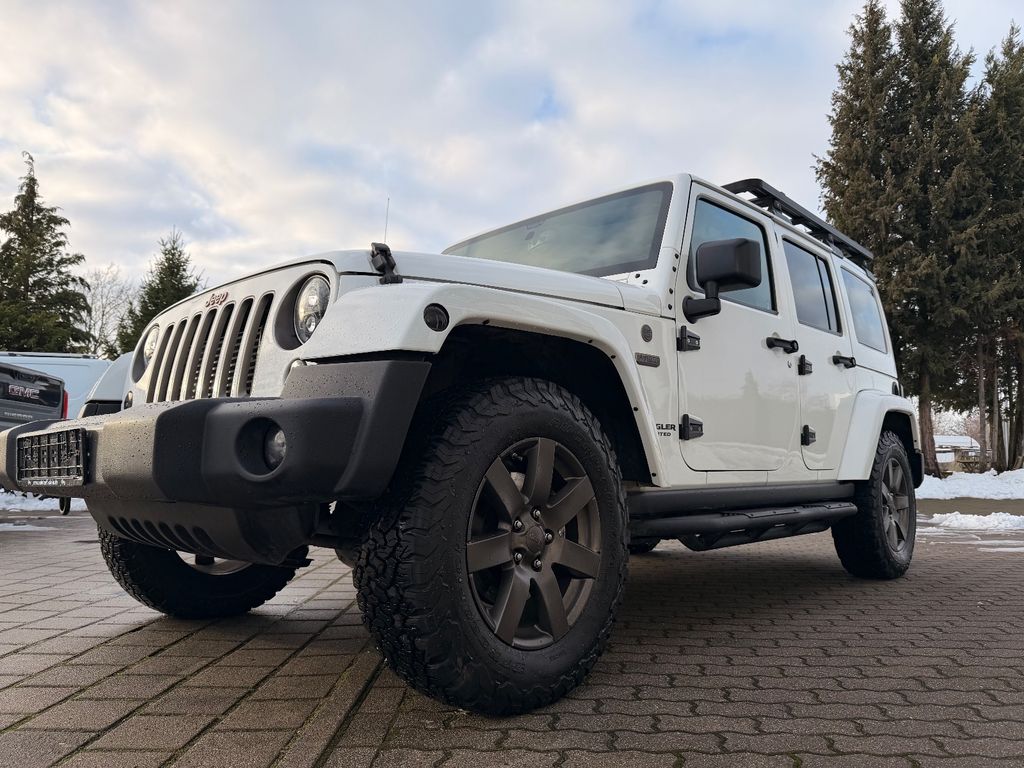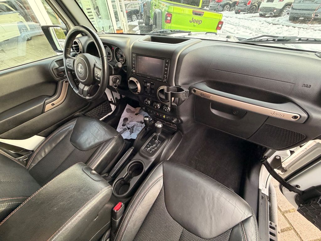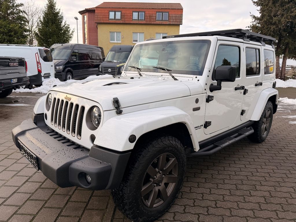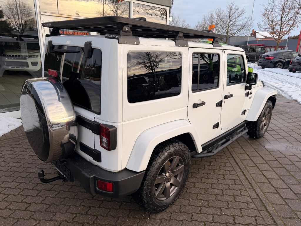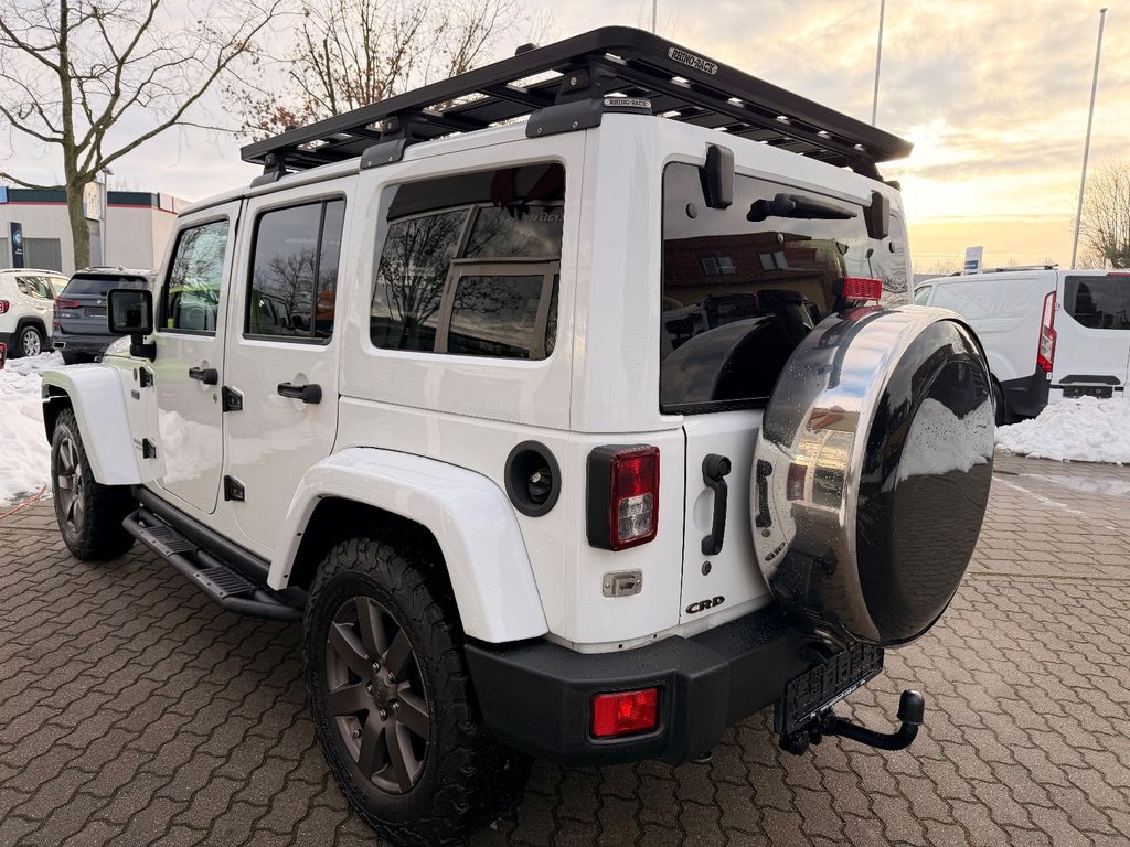 Weitere Ausstattung:75th Anniversary, Airbag Fahrer-/Beifahrerseite, Antriebs-Schlupfregelung (ASR), Audio-Navigationssystem: UConnect Multimedia-System mit Navigationssystem, Audiobedienung am Lenkrad, Automatische Fahrlichtschaltung / Lichtsensor, Außenspiegel heizbar, Bremsassistent, Dual-Top (Hardtop Wagenfarbe und Softtop), Freisprechanlage UConnect (mit Bluetooth-Schnittstelle), Fußmatten mit Reifenprofilstruktur (Mopar), Info-Center (EVIC), Innenspiegel mit Abblendautomatik, Karosserie: 4-türig, Klimaautomatik, Kotflügelverbreiterung in Wagenfarbe, Lenkrad mit Multifunktion, Lenksäule (Lenkrad) höhenverstellbar, LM-Felgen, Motor 2,8 Ltr. - 147 kW CRD KAT, Motorhaube mit Powerdome, Radstand 2947 mm, Reserverad in Fahrbereifung, Rücksitz geteilt / klappbar, Rücksitz klappbar, Schadstoffarm nach Abgasnorm Euro 6, Schwellerrohr (Rock Rails), Seitenairbag, Sitz vorn links höhenverstellbar, Sitzbezug / Polsterung: Teilleder, Sonderlackierung, Sound-System Alpine Premium, Trittbretter seitlich, Unterfahrschutz hinten, Verglasung hinten abgedunkelt, Volltüren (Fensterscheibe Glas)