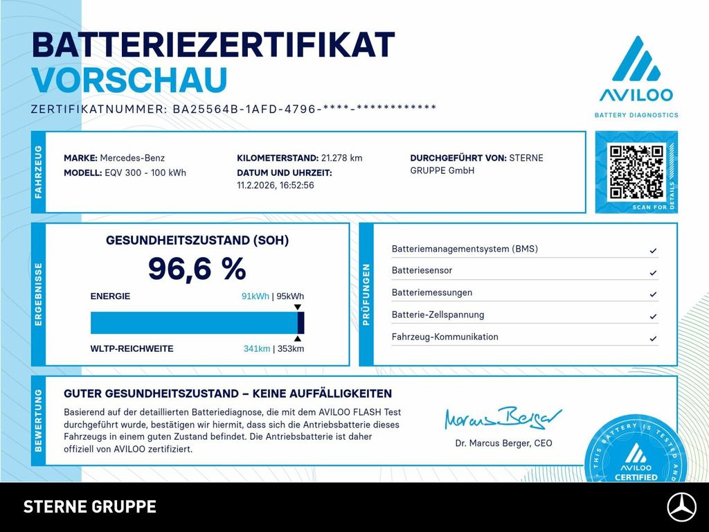 Das Fahrzeug verfügt über ein Batterie Zertifikat. Für weitere Informationen nehmen Sie bitte direkten Kontakt auf.