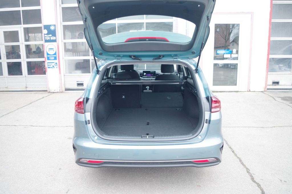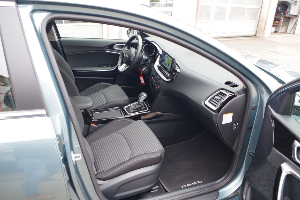 Innenausstattung: Sportsitze in Stoff schwarz, Fahrersitz höhenverstellbar, Ablagetaschen an den Vordersitzlehnen, Lenksäule höhen- und längenverstellbar, 3-Speichen Multifunktionslederlenkrad (heizbar), Mittelarmlehne vorne & hinten, Wahlhebel aus Leder, Zündschloss beleuchtet, Rücksitzbank geteilt umklappbar, Sonnenblenden mit Spiegel (beleuchtet), variabler Laderaumboden, Interieur-Leisten in Klavierlack, LED-Leuchten in der Heckklappenverkleidung, Textil-Fußmatten mit Ceed Logo in schwarz.