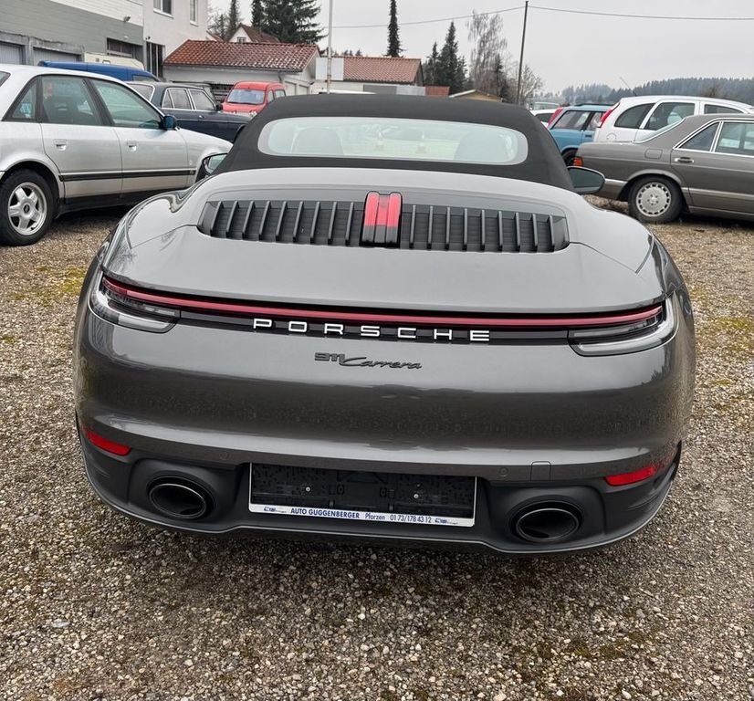 Airbag Fahrer-/Beifahrerseite, Antriebsart: Heckantrieb, Außenspiegel asphärisch, links, Außenspiegel elektr. verstell- und heizbar, beide, Blinkleuchten LED, Cabrio, Connect Plus (Bluetooth, Apple CarPlay, WLAN, Vehicle-Tracking-System), Dachhimmel Stoff, Diebstahl-Warnanlage mit Innenraumüberwachung, Drehzahlmesser, Einschaltautomatik für Fahrlicht, Einstiegsblenden mit Modellbezeichnung (Aluminium), Fahrassistenz-System: Berganfahr-Assistent (Hill-Holder), Fahrassistenz-System: Kollisionswarnsystem mit Bremseingriff und Fußgängererkennung, Fahrassistenz-System: Park-Assistent vorn und hinten inkl. Rückfahrkamera, Fußmatten, Getriebe 8-Gang - Doppelkupplungsgetriebe (PDK), Getränkehalter, Hauptscheinwerfer LED, Heckleuchten LED, Heckscheibe heizbar, Heckspoiler, Innenraumfilter: Aktivkohlefilter (Geruchsfilter), Interieur-Paket: Diamar Dark Silver, Isofix-Aufnahmen für Kindersitz an Beifahrersitz, Karosserie: 2-türig, Keyless Drive, Kleiderhaken Sitzrückenlehne Leder, Klimaautomatik 2-Zonen, Kopf-Airbag-System Porsche Side Impact Protection System (POSIP), Kopf-Schulter-Airbag vorn (Thoraxbag), Motor 3,0 Ltr. - 283 kW Turbo KAT, Otto-Partikelfilter (OPF), Parkbremse elektrisch, Porsche Active Suspension Management (PASM), Porsche Communications Management (PCM) inkl. Online - Navigationsmodul, Porsche Traction Management (PTM), Reifendruck-Kontrollsystem, Schadstoffarm nach Abgasnorm Euro 6d-TEMP, Schriftzug Modellreihe, Schwellerabdeckung / -verkleidung lackiert, Sound-Package Plus, Sport Taste, Start/Stop-Anlage, Turbo, Vehicle-Tracking-System (PVTS), Verdeckbetätigung elektrisch, Verglasung getönt, Windschott elektrisch