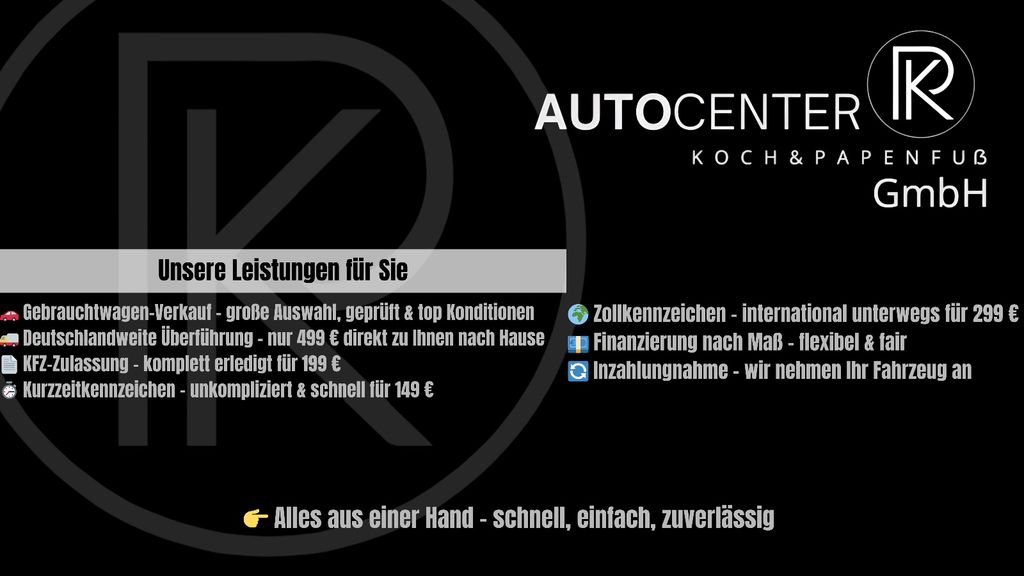 Willkommen bei Autocenter Koch & Papenfuß GmbH – Ihrem Partner für Gebrauchtwagen! Bei uns steht die Kundenzufriedenheit an oberster Stelle! Wir möchten, dass der Kauf Ihres Fahrzeugs genauso viel Spaß macht wie die Fahrt selbst. Mit einer großen Auswahl an hochwertigen Gebrauchtwagen bieten wir Ihnen die Möglichkeit, das perfekte Fahrzeug zu finden – zuverlässig, fair und zu attraktiven Preisen. Unsere Leistungen für Sie: Verkauf von Gebrauchtfahrzeugen: Eine breite Auswahl an geprüften Fahrzeugen zu besten Konditionen.*Deutschlandweite Fahrzeugüberführung für nur 499 € – bequem zu Ihnen nach Hause.- KFZ Zulassung für nur 199 €: Wir kümmern uns um alles, damit Sie schnell auf die Straße können.