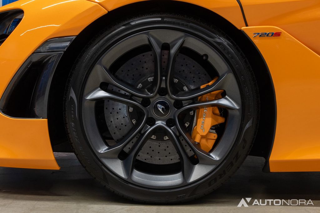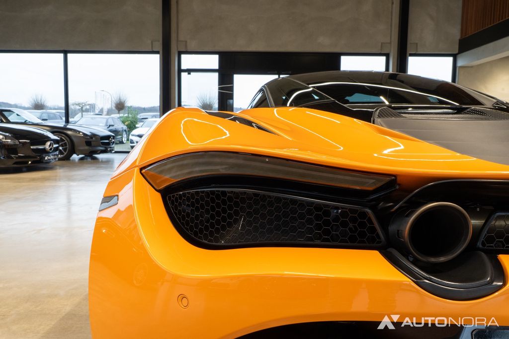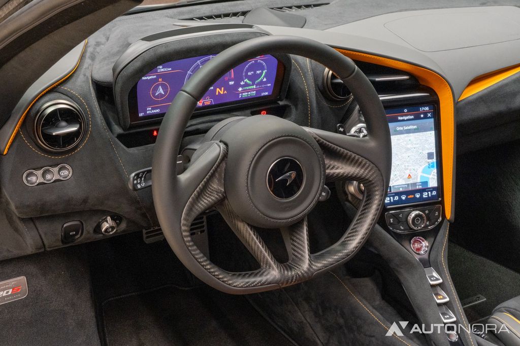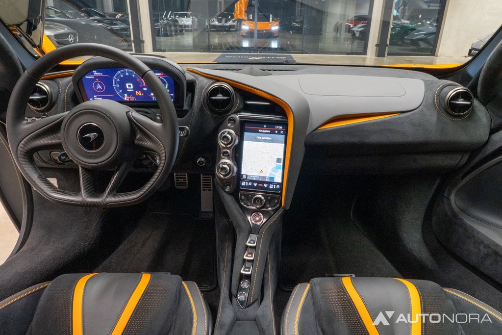 Lift system, doors with Gorilla Glass, soft-close doors, carbon exterior package 1, carbon exterior mirrors, carbon front hood air intake, carbon rear air intake, sports exhaust system, electrically adjustable and heated seats, carbon interior components. Ambient lighting, front and rear parking sensors, 360-degree surround view cameras, 20" alloy wheels in 5-double-spoke sport design in stealth (dark gray), ceramic brake system with brake calipers in McLaren Orange, tire pressure monitoring, vehicle tracking system, alarm system, floor mats, car cover, battery maintenance device
