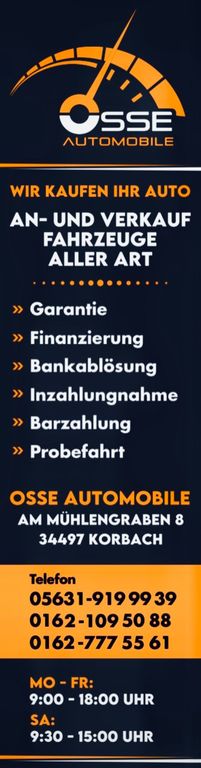 Beim Kauf von einem unserer Gebrauchtwagen erhält dieser vor Übergabe selbstverständlich kostenlos einen frischen Ölwechsel. All unsere Fahrzeuge werden zudem mit einer 12 monatigen Händlergewährleistung verkauft, gegen Aufpreis erhalten Sie auf Wunsch eine Gebrauchtwagengarantie mit erweiterter Deckung.Gerne nehmen wir auch Ihr „altes“ Fahrzeug zu einem fairen Preis in Zahlung. Hierfür lassen wir es durch die DAT (Deutsche Automobil Treuhand) bewerten. Sie möchten Ihr neues Auto über uns finanzieren? Wir gestalten Ihnen ein individuelles Finanzierungsangebot für Ihr Wunschfahrzeug - auch ohne Anzahlung.Kommen Sie gern für eine Besichtigung und Probefahrt vorbei und überzeugen Sie sich selbst von unserem rundum-Service. Ihr Team von Osse Automobile .- Deutsches Fahrzeug,