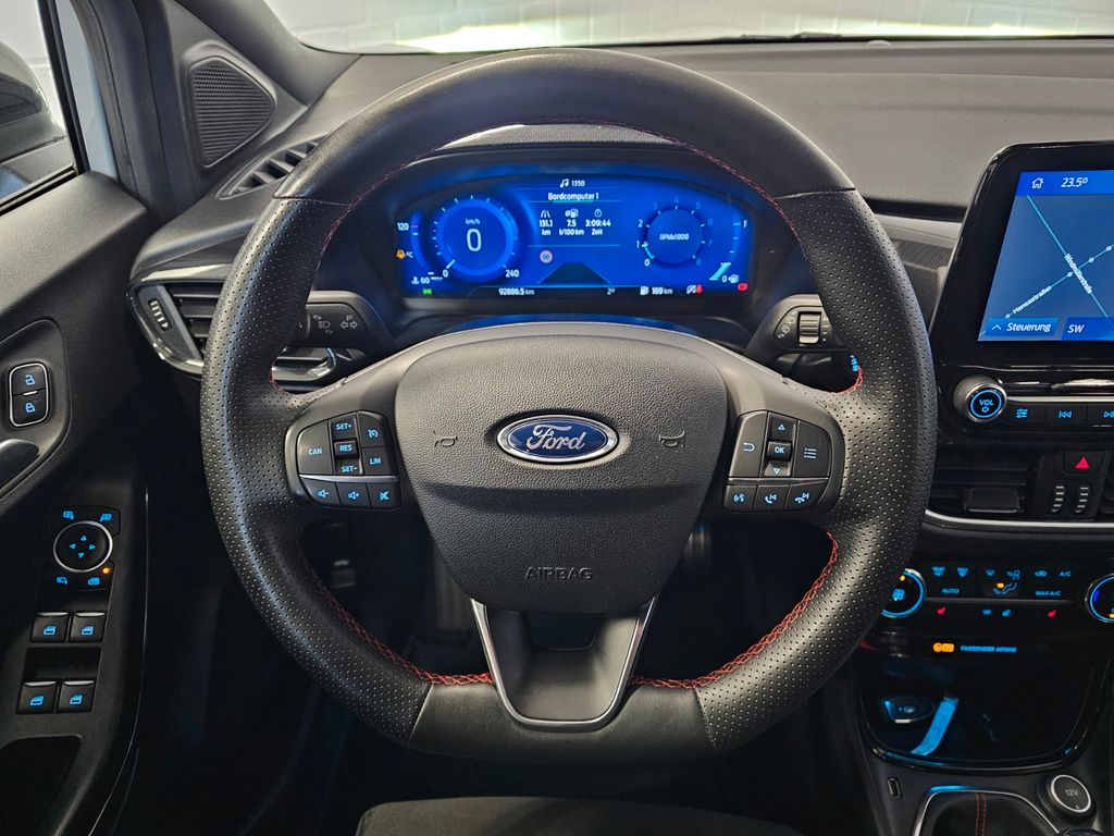 Ambiente-Beleuchtung vorn (LED), Antischlupfregelung (ASR), Audio-Navigationssystem Ford mit AppLink, Außenspiegel elektr. anklappbar, Außenspiegel elektr. verstell- und heizbar, Body-Styling-Paket, Dachhimmel Stoff, dunkel, Eco-Anzeige für verbrauchsoptimiertes Fahren (EcoCoach), Einparkhilfe hinten, Fahrassistenz-System: Berganfahr-Assistent (Hill-Holder), Fahrassistenz-System: Falschfahrer-Warnfunktion, Fahrassistenz-System: Fernlichtassistent (Scheinwerfer mit Abblendautomatik), Fahrassistenz-System: Notbrems-Assistent, Fahrassistenz-System: Post-Collision-System, Fahrassistenz-System: Pre-Collision-System, Fahrassistenz-System: Spurhalteassistent mit Müdigkeitserkennungs-Sensor, Fahrassistenz-System: Verkehrsschildassistent, Farbdisplay für Bordcomputer, Fensterheber elektrisch vorn + hinten mit Komfortschließung, FordPass Connect inkl. eCall, Fußmatten Teppich, Getriebe 6-Gang - Typ: 6MX65, Heckleuchten LED, Innenraumfilter: Staub- und Pollenfilter, Intelligent Protection System (IPS), Intelligenter Geschwindigkeits-Begrenzer, Isofix-Aufnahmen für Kindersitz, Karosserie: 5-türig, Kombiinstrument Digitalanzeige 12,3 Zoll, Kopfstützen hinten mechan. verstellbar (3 Stück), Lackierung Blazer-Blau uni, Laderaumboden variabel (Ford Megabox), Lendenwirbelstütze Sitz vorn links, Lenkrad mit Schaltwippen, Lenksäule (Lenkrad) höhen-/längsverstellbar, LM-Felgen, Mild-Hybrid 114 kW (Motor 1,0 Ltr. - 114 kW EcoBoost), My Key (2. Fahrzeugschlüssel programmierbar), Nebelscheinwerfer LED, Otto-Partikelfilter (OPF), Pedale Aluminium, Radstand 2588 mm, Reifen-Reparaturkit, Reifendruck-Kontrollsystem, Rücksitzlehne geteilt/klappbar (60:40), Schadstoffarm nach Abgasnorm Euro 6d-TEMP, Scheinwerfer LED, Scheinwerfer-Assistent mit Tag-/Nachtsensor, Sitze vorn höhenverstellbar, Sonnenblende links mit Spiegel (beleuchtet), Sonnenblende rechts mit Spiegel (beleuchtet), Sport-Fahrwerk, Sportsitze vorn