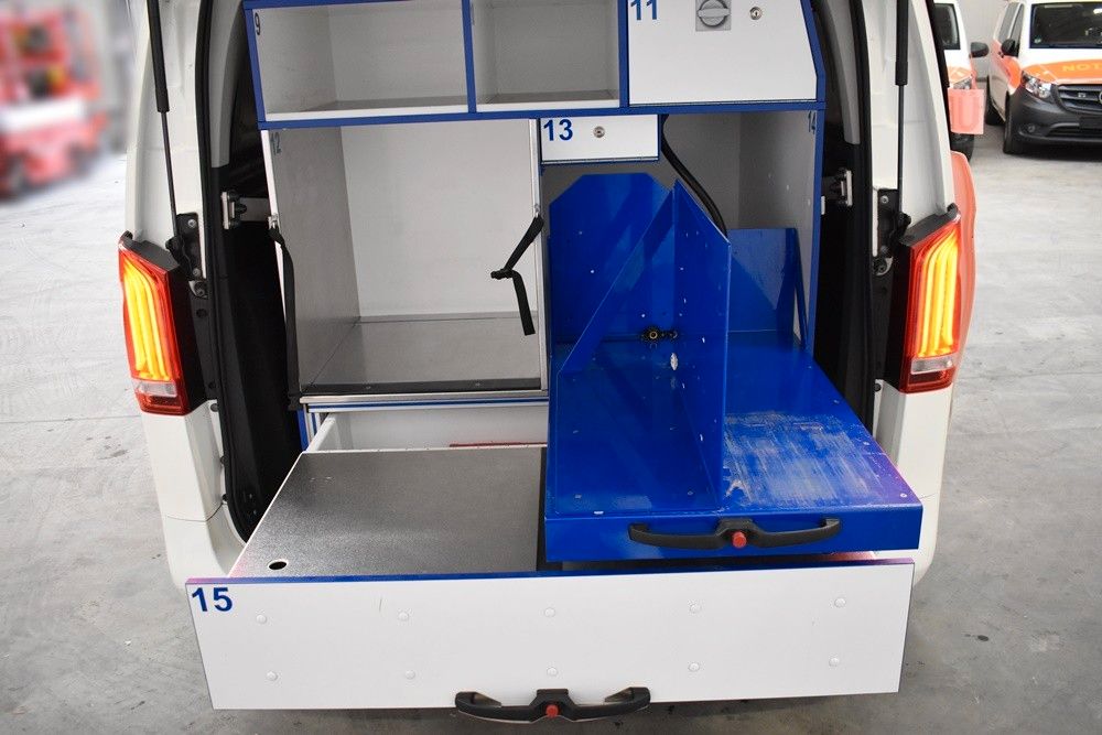 Druckkammerlautsprecher, Martin-Anlage, LED-Signalanlage, Unfalldatenspeicher, Thermofach, Kühlfach, Handy-Freisprecheinrichtung, Schrank im Heckbereich, Arztsitz, Arbeitstisch