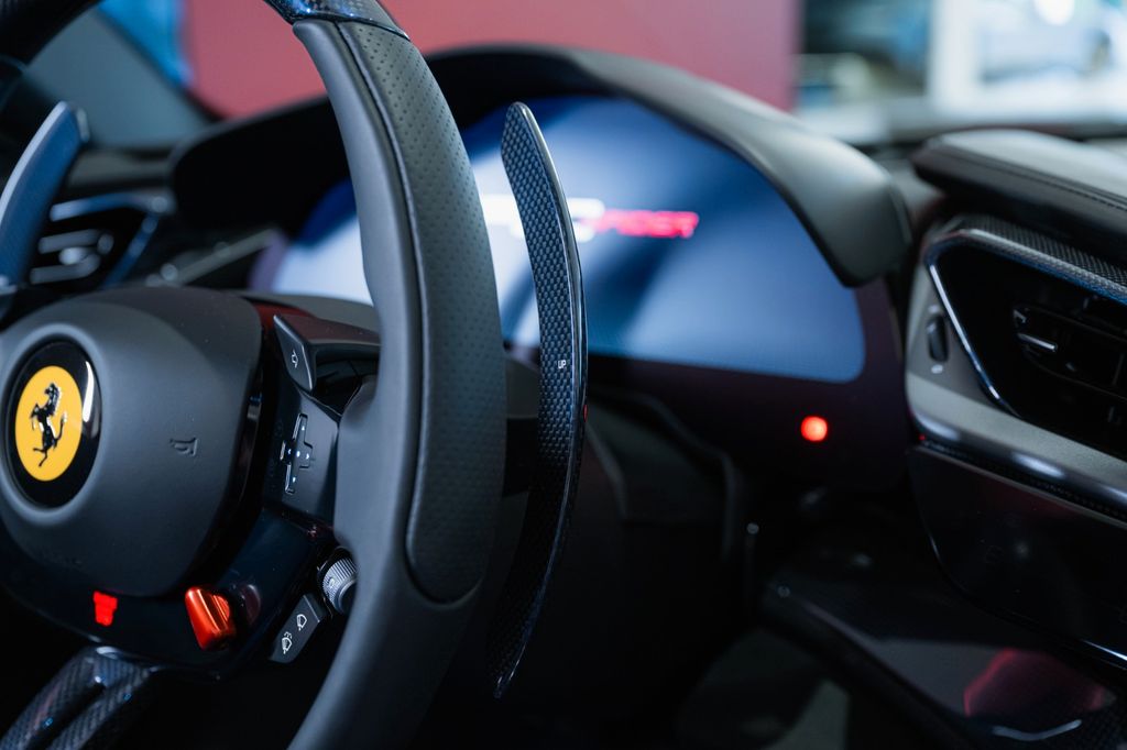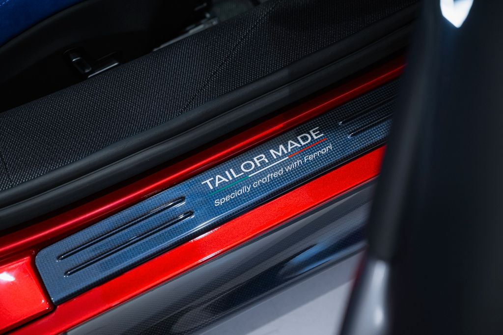 Kickplate in transitional Zaffiro carbon fibre with Tailor Made logo and "Specially crafted with Ferrari" in Argento Nurburgring & Italian Tricolore Stripe