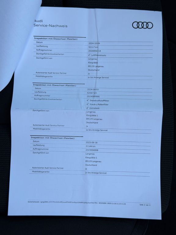 Sonderausstattung:Anhängerkupplung Vorbereitung, Business-Paket, Einparkhilfe vorn und hinten, akustisch und optisch mit selektiver Anzeige (APS Plus), Fahrassistenz-System: Spurhalteassistent (active lane assist), Fzg. ohne Audi Phone Box, Harnstofftank (SCR): 24 Ltr., Innenausstattung: Dekoreinlagen Aluminium Ellipse silber, Kindersicherheits-Paket, Komfort-Klimaautomatik 3-Zonen, Kopfstützen variabel verstellbar, Lendenwirbelstützen vorn, elektr. verstellbar, LM-Felgen 8,5x19 (5-V-Speichen-Stern-Design, Titanoptik matt, glanzgedreht), Metallic-Lackierung, Neuwagen-Reifengarantie, Rückfahrkamera, Sitzbezug / Polsterung: Stoff System, Sportsitze vorn, Verglasung hinten abgedunkelt (Privacyverglasung)