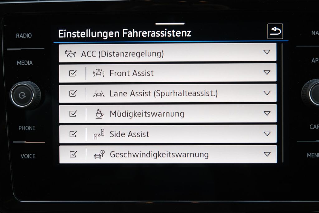 - Assistenten: Müdigkeitserkennung, Verkehrszeichenerkennung, Lichtsensor, Notbremsassistent, Spurhalteassistent