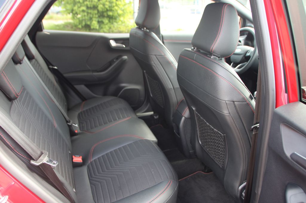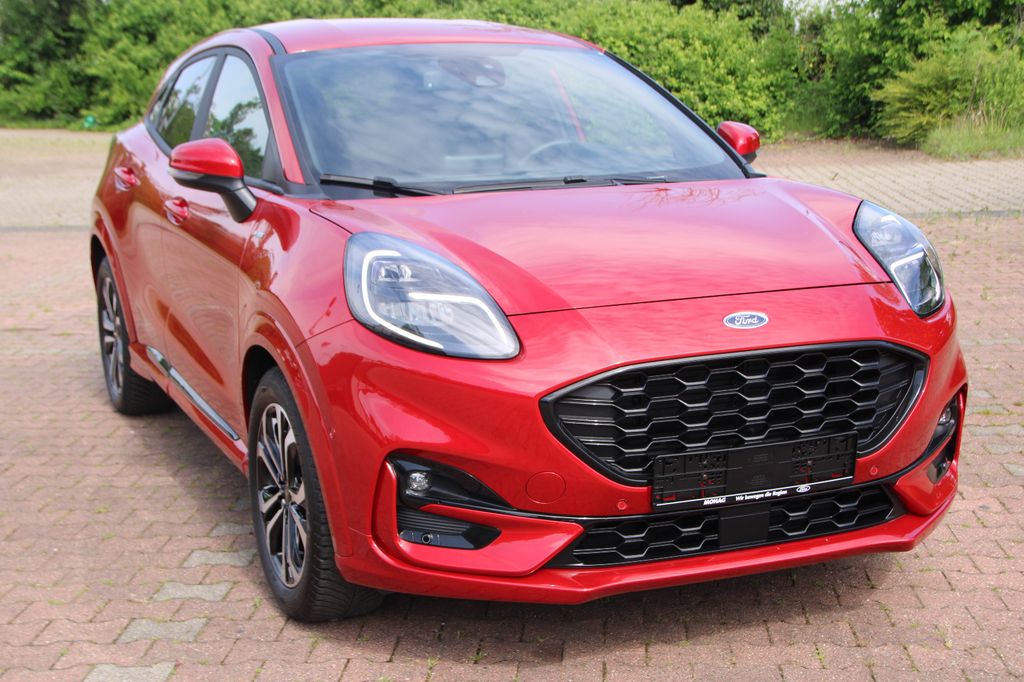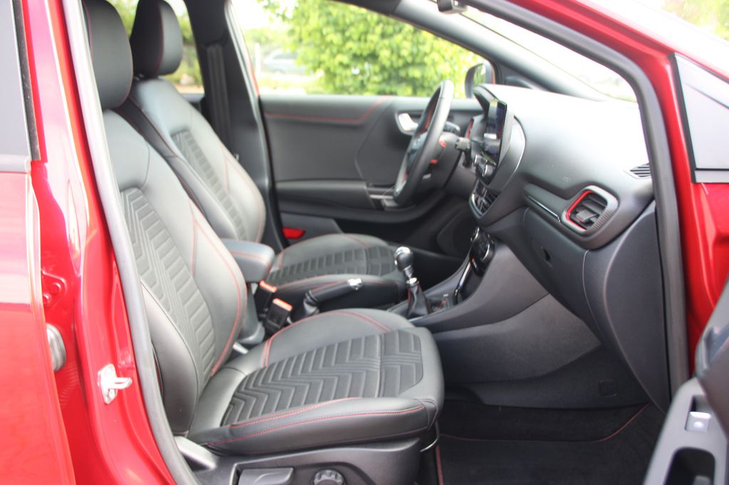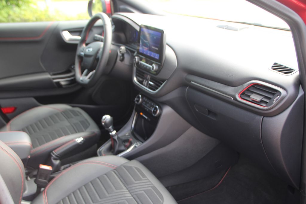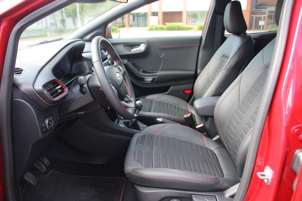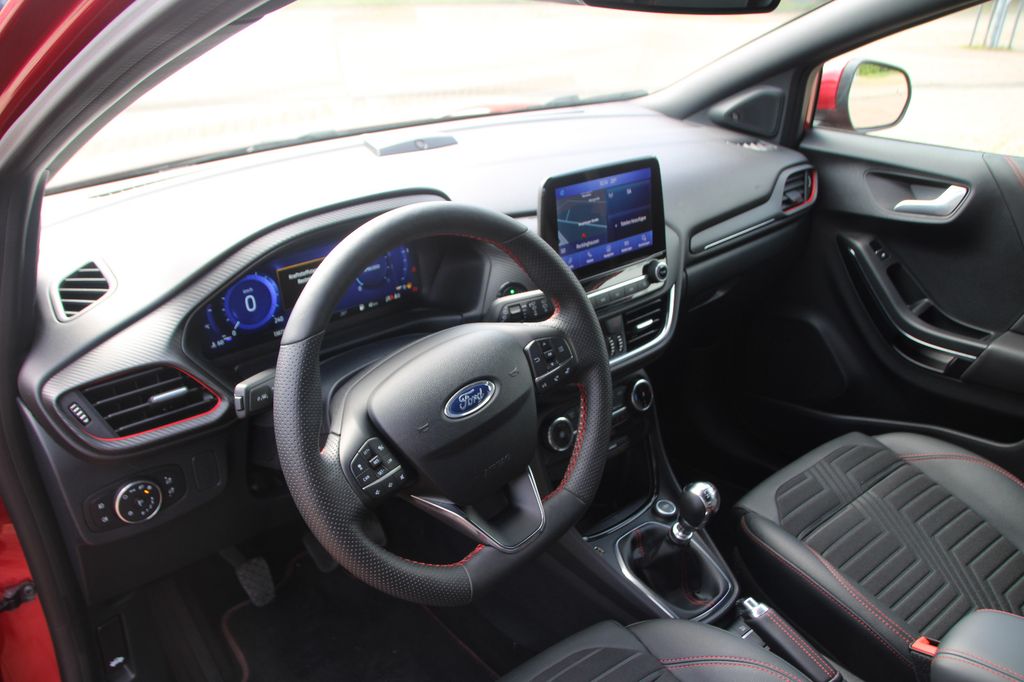 Ambiente-Beleuchtung vorn (LED), Antischlupfregelung (ASR), Audio-Navigationssystem Ford mit AppLink, Außenspiegel elektr. anklappbar, Außenspiegel elektr. verstell- und heizbar, Body-Styling-Paket, Dachhimmel Stoff, dunkel, Eco-Anzeige für verbrauchsoptimiertes Fahren (EcoCoach), Einparkhilfe hinten, Fahrassistenz-System: Berganfahr-Assistent (Hill-Holder), Fahrassistenz-System: Falschfahrer-Warnfunktion, Fahrassistenz-System: Fernlichtassistent (Scheinwerfer mit Abblendautomatik), Fahrassistenz-System: Notbrems-Assistent, Fahrassistenz-System: Post-Collision-System, Fahrassistenz-System: Pre-Collision-System, Fahrassistenz-System: Spurhalteassistent mit Müdigkeitserkennungs-Sensor, Fahrassistenz-System: Verkehrsschildassistent, Farbdisplay für Bordcomputer, Fensterheber elektrisch vorn + hinten mit Komfortschließung, FordPass Connect inkl. eCall, Fußmatten Teppich, Getriebe 6-Gang - Typ: 6MX65, Heckleuchten LED, Innenraumfilter: Staub- und Pollenfilter, Intelligent Protection System (IPS), Intelligenter Geschwindigkeits-Begrenzer, Isofix-Aufnahmen für Kindersitz, Karosserie: 5-türig, Kombiinstrument Digitalanzeige 12,3 Zoll, Komfort-Paket, Kopfstützen hinten mechan. verstellbar (3 Stück), Lackierung Blazer-Blau, Laderaumboden variabel (Ford Megabox), Lendenwirbelstütze vorn, Lenkrad (Sport/Leder, ST), Lenksäule (Lenkrad) höhen-/längsverstellbar, LM-Felgen, Mild-Hybrid 114 kW (Motor 1,0 Ltr. - 114 kW EcoBoost), My Key (2. Fahrzeugschlüssel programmierbar), Nebelscheinwerfer LED, Otto-Partikelfilter (OPF), Pedale Aluminium, Radstand 2588 mm, Reifen-Reparaturkit, Reifendruck-Kontrollsystem, Rücksitzlehne geteilt/klappbar (60:40), Schadstoffarm nach Abgasnorm Euro 6d, Scheinwerfer-Assistent mit Tag-/Nachtsensor, Sitzbezug / Polsterung: Kunstleder, Sitze vorn höhenverstellbar, Sonnenblende links mit Spiegel (beleuchtet), Sonnenblende rechts mit Spiegel (beleuchtet), Sport-Fahrwerk, Sportsitze vorn, Standard Variante, Start/Stop-Anlage, Türgriffe außen Wagenfarbe, Verglasung hinten abgedunkelt (Privacy Glass)