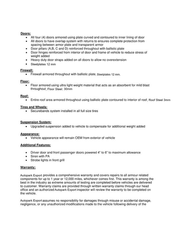 Armor & Protection – Certified B6 Ballistic Level: This vehicle is professionally armored to B7 standard, designed to withstand 7.62×51 mm NATO rounds (AP/HC) and hand grenade blasts, offering full 360° protection while maintaining the SUV’s factory aesthetics and comfort.