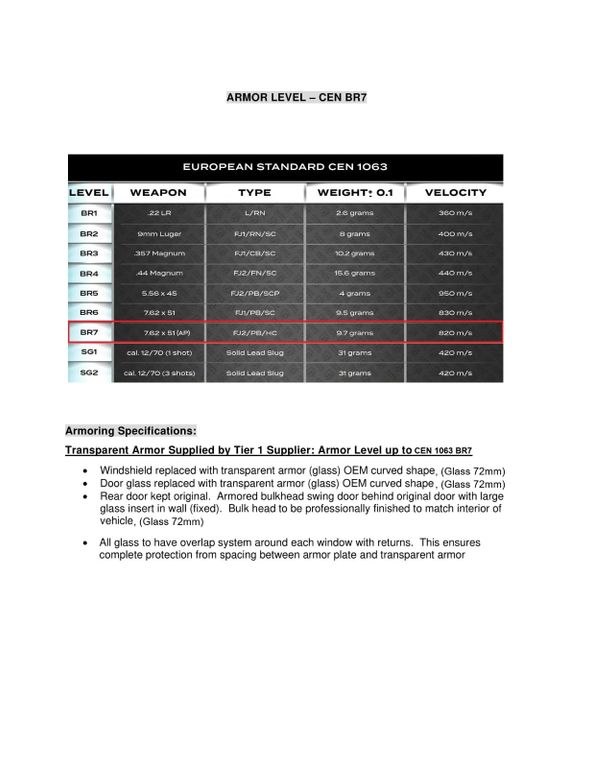 - Panzerung nach Europäischem Standard CEN 1063 – Schutzklasse B7 Die Schutzklasse B7 nach dem europäischen Standard CEN 1063 stellt den höchsten verfügbaren ballistischen Schutz für zivile Fahrzeuge dar. Sie ist speziell konzipiert, um den Fahrzeuginsassen auch unter extremen Bedrohungslagen maximalen Schutz zu bieten.