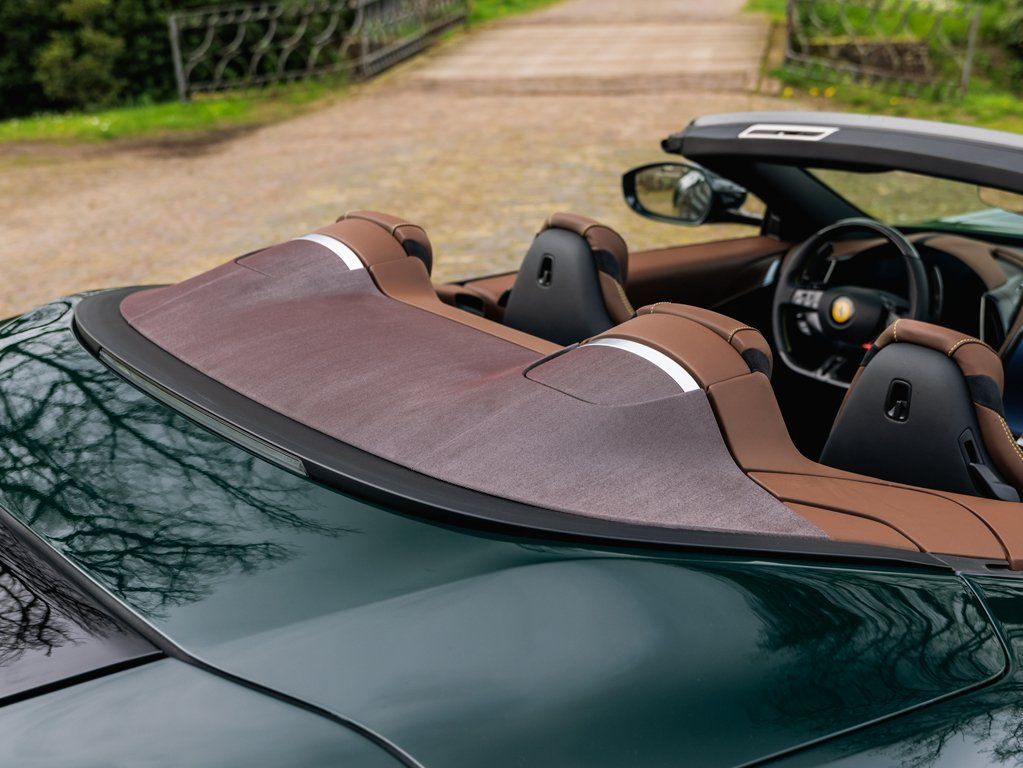 Introducing the Ferrari Roma Spider, an embodiment of timeless elegance and performance, finished in the iconic Verde British Racing with a luxurious Cioccolato leather interior.