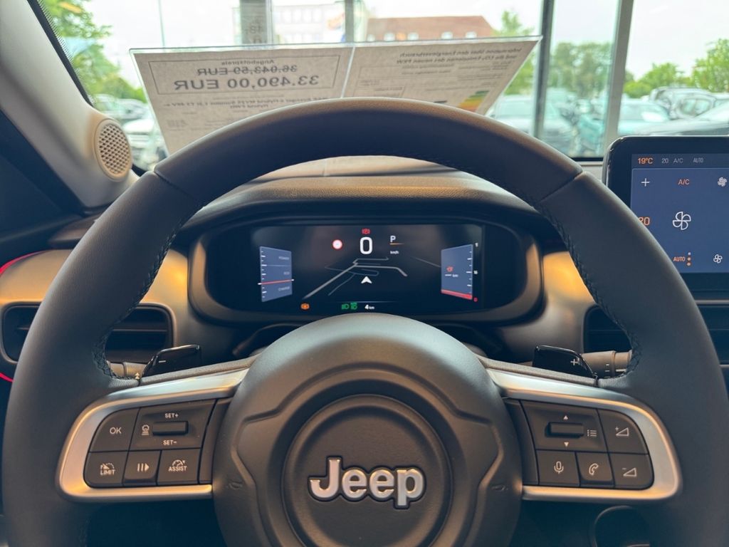- Weiteres: Heckklappenöffnung elektrisch, ISOFIX-Aufnahmen für Kindersitz, Geschwindigkeits-Regelanlage (Tempomat), Einparkhilfe hinten, Lenksäule (Lenkrad) mechan. verstellbar, Getriebe 6-Gang - Doppelkupplungsgetriebe (DTC), LM-Felgen, Innenspiegel mit Abblendautomatik, Audiosystem: UConnect Smartouch Multimedia, Heckleuchten LED, Sitzbezug / Polsterung: Stoff / Vinyl, Lenkrad (Kunstleder), Info-Center mit 10,25-Zoll Display, Schadstoffarm nach Abgasnorm Euro 6e, Traction-Control-System (Selec-Terrain), Fahrassistenz-System: Autonomer Notbrems-Assistent mit Fußgängererkennung, Außenspiegel elektr. verstell- und heizbar, beide, Infotainment-System: UConnect mit DAB Radioempfang (Touchscreen 10,25-Zoll), Mittelarmlehne vorn mit Staufach, Sitz vorn rechts verstellbar (4-fach), Armaturentafel silber, Smartphone Schnittstelle (Apple CarPlay & Android Auto), Schließ-/Startsystem Keyless Go, Projektor-Scheinwerfer LED, Motor 1,2 Ltr. - 74 kW Mild-Hybrid, Reifen-Reparaturkit, Airbag Fahrer-/Beifahrerseite, Anti-Blockier-System (ABS), Außenspiegel elektr. verstellbar, beide, Start-Stop-Knopf, Zentralverriegelung, Rückfahrkamera mit 180° Umgebungsansicht, Ambiente-Beleuchtung LED, Antriebsart: Frontantrieb, Auffahrwarnsystem (Forward Collision Warning), Außenspiegel elektr. anklappbar, Außenspiegel mit Totwinkel-Assistent, Autobahnassistent (Highway Assist), Bergabfahr-Assistent, DAB-Tuner (Radioempfang digital), Elektron. Stabilitäts-Programm, Elektron. Traktionskontrolle, Fahrassistenz-Paket, Fensterheber elektrisch vorn und hinten, Fernlichtassistent, Frontscheibe mit Wischerablagenheizung, Gepäckraumboden höhenverstellbar, Induktionsladeschale für Smartphone, Klimaautomatik, LED & Style-Paket, Lichtassistent (Coming Home, Leaving Home), Mild-Hybrid 74 kW (Motor 1,2 Ltr. - 74 kW), Müdigkeitserkennung, Nebelscheinwerfer LED, Park-Assistent mit 360° Bewegungssensoren, Parkbremse elektro-mechanisch, Querverkehrs-Assistent Heck (Rear Cross Path Detection), Sitz vorn links verstellbar (6-fach), Sitzheizung vorn, Spurhalteassistent, Überschlag-Schutzsystem (ERM), Unterfahrschutz Silber, Verglasung hinten abgedunkelt, Verkehrszeichenerkennung (TSR), Winter-Paket, ZV mit Fernbedienung