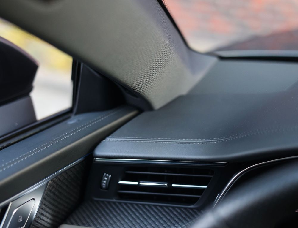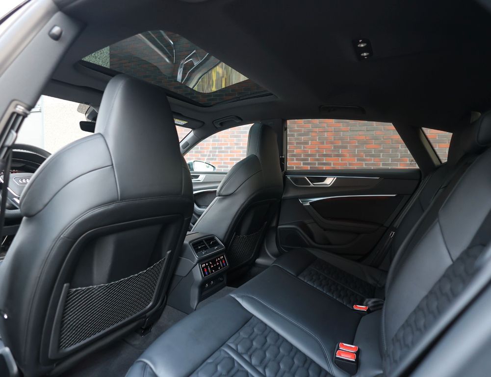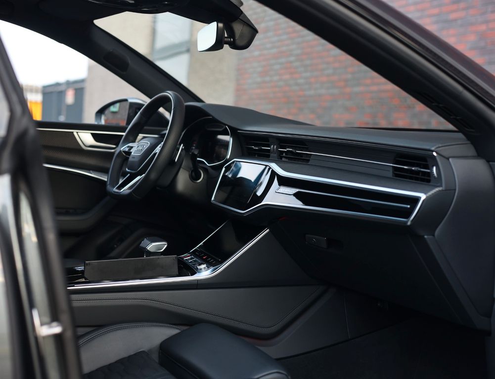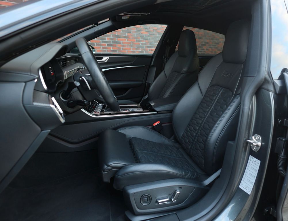 The black leather interior is equally impressive, featuring carbon trim inlays, a leather-wrapped dashboard and a panoramic glass roof. In addition, this RS7 distinguishes itself with an extensive list of options, including Soft-Close doors, Matrix LED headlights, a Bang & Olufsen sound system, 360-degree camera, head-up display and the “City” and “Tour” driver assistance packages.