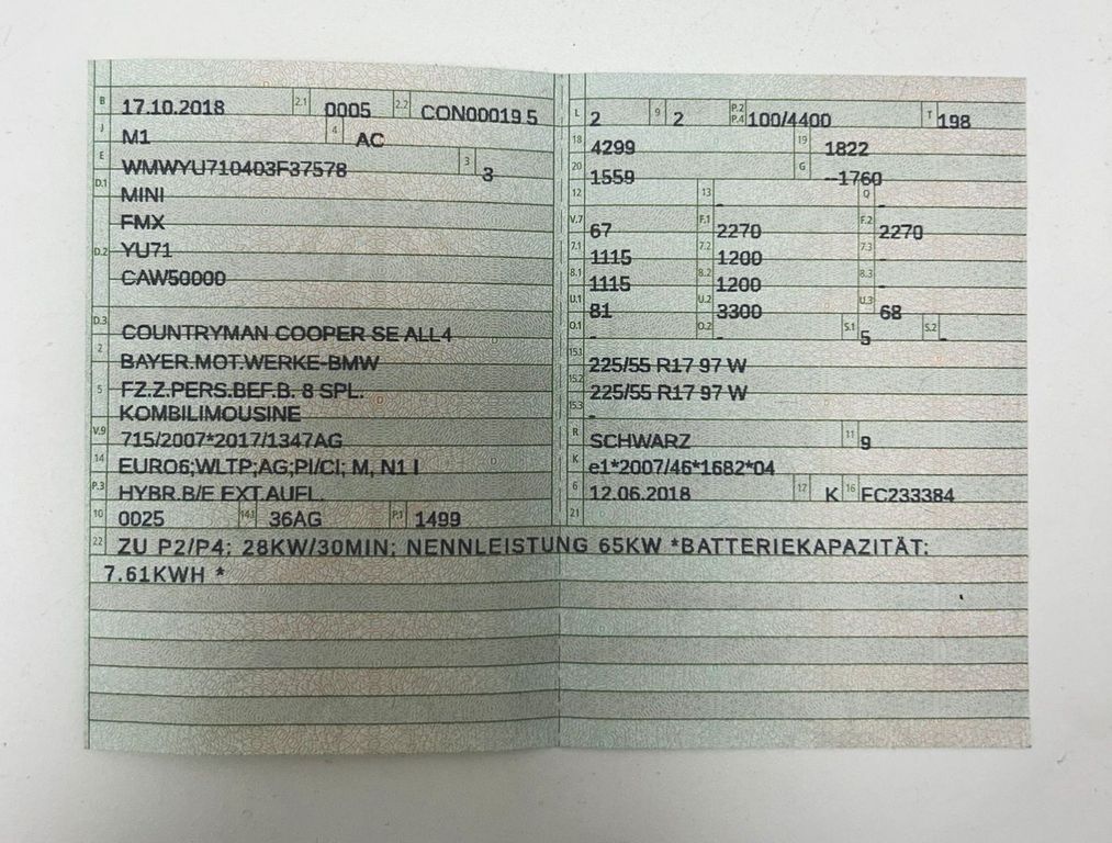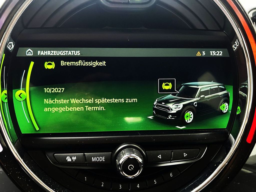 Antriebsart: Allradantrieb, Autom. Begleitfunktion der Beleuchtung (Follow me home), Blinkleuchten Weiß, Bremsassistent, Bremsenergierückgewinnung, Dach Wagenfarbe, Dachhimmel Satellite Grey, Dachspoiler, Drehzahlmesser, Dynamische Bremsleuchte, Elektromotor 65 kW (Hybridantrieb), Elektron. Bremskraftverteiler, Erste Hilfe-Kasten / Verbandkasten, Exterieurumfänge Sidescuttles mit integrierten Blinkern, Fahrassistenz-System: Auffahrwarnsystem mit Bremsfunktion, Gepäckraumabdeckung / Rollo, Getriebe Automatik - mit Steptronic (6-Stufen), Getränkehalter, Griffleiste Heckklappe, Schwarz hochglänzend, Hybrid 165 kW (Motor 1,5 Ltr. 100 kW), Innenausstattung: Color-Line Carbon Black, Innenausstattung: Interieur-Oberfläche Hazy Grey, Karosserie: 5-türig, Klimaanlage, Lenkrad (Sport/Leder), Lenksäule (Lenkrad) mechan. verstellbar, MINI Driving Modes, Nebelschlussleuchte, Parkbremse elektrisch, Personalisierungssystem (Personal Profile), Radstand 2670 mm, Rücksitzlehne geteilt/klappbar, Schadstoffarm nach Abgasnorm Euro 6, Schalt-/Wählhebelgriff Leder, Schaltpunktanzeige, Scheibenwaschdüsen und Außenspiegel beheizt, Sitzausstattung: 5-Sitzer, Sitzbezug / Polsterung: Stoff Firework, Sitze vorn höhenverstellbar, Sitze vorn mechanisch verstellbar, Sonnenblenden mit Spiegel, Türgriffe innen verchromt, Wagenheber, Warndreieck, Wärmeschutzverglasung getönt, Zentralinstrument mit LED-Ring