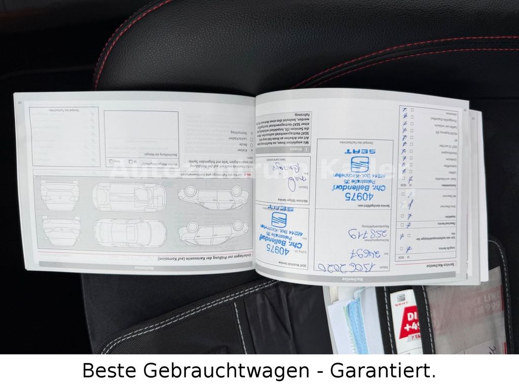 Ablage-Paket, Airbag Fahrer-/Beifahrerseite, Alcantara-Paket, Audio-Paket, Audiosystem mit Touchscreen-Farbdisplay, Außenspiegel elektr. verstell- und anklappbar, Außenspiegel und Türgriffe außen in Wagenfarbe, Bi-Xenon-Scheinwerfer mit Kurvenlicht, Bordcomputer, Bremsassistent, Chrom-Paket, Einparkhilfe vorn und hinten, Fahrassistenz-System: Müdigkeitserkennung, Fensterheber elektrisch vorn + hinten, FR-Line, Handschuhfach beleuchtet, Handschuhfach mit Kühlfach, Heckleuchten LED, Innenausstattung: Dekoreinlagen Brushed Black, Karosserie: 5-türig, Knieairbag Fahrerseite, Kofferraumbeleuchtung, Kopf-Airbag-System, Kühlergrill mit Chromrand, Lenksäule (Lenkrad) verstellbar, Leuchtweitenregelung, LM-Felgen, Motor 1,4 Ltr. - 110 kW 16V TSI, Raucher-Paket, Schadstoffarm nach Abgasnorm Euro 6, Schalt-/Wählhebelgriff Leder, Scheibenwaschdüsen heizbar, SEAT Media-System Plus, Seitenscheiben hinten und Heckscheibe abgedunkelt, Sitz vorn links höhenverstellbar, Sitzheizung vorn, Sonnenblende links mit Spiegel (beleuchtet), Sonnenblende rechts mit Spiegel (beleuchtet), Sport-Fahrwerk, Start/Stop-Anlage, Startanlage Keyless Access, Steckdose (12V-Anschluß) im Koffer-/Laderaum, Verzurrösen Koffer-/Laderaum