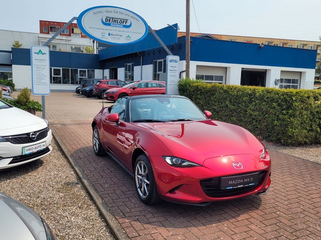 Dynamische Stabilitätskontrolle mit Traktionskontrollsystem, Heckscheibe aus Glas beheizbar, Stoffverdeck in Schwarz, 3-Speichen-Sport-Lederlenkrad, Lederschaltknauf und -handbremsgriff, Mazda Connect mit 8,8 Zoll Multimedia-Display, Ausstiegswarner, Ausparkhilfe mit Bremsfunktion, Track Mode, Außenspiegel in Wagenfarbe, 16-Zoll-Leichtmetallfelgen in Bright Dark, BOSE® Sound-System® mit 9 Lautsprechern inkl. Lautsprechern in den Kopfstützen, Einstiegsleisten, Rahmenloser Innenrückspiegel automatisch abblendend, Lederausstattung in Schwarz mit silbernen Ziernähten, Mittlkonsole in Kunstleder eingefasst,