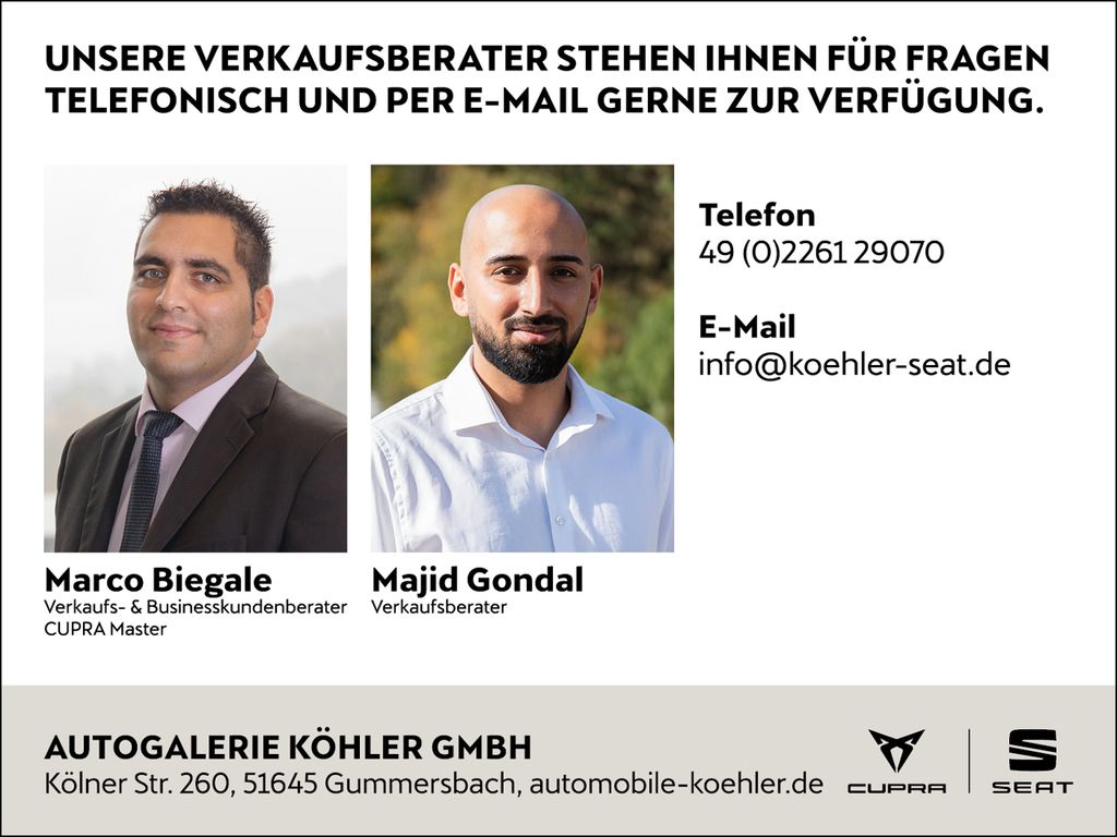 Ausstattungspakete:- Ausstattungs-Paket: Pro: Bluetooth-Schnittstelle mit Freisprecheinrichtung integriert, Bluetooth Audio-Streaming, Sprachsteuerungs-System, Kombiinstrument digital (virtual cockpit), Full Link (MirrorLink, Apple CarPlay und Android Auto), Scheinwerfer Voll-LED, USB-Schnittstelle vorn (2-fach, Typ C), Audio-Navigationssystem mit Touchscreen Farbbildschirm, Mobile Online Dienste Seat Connect