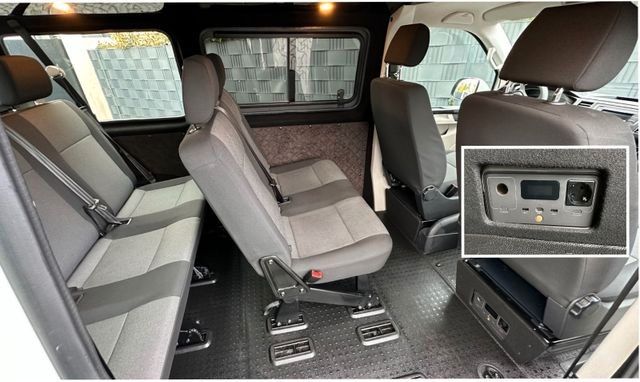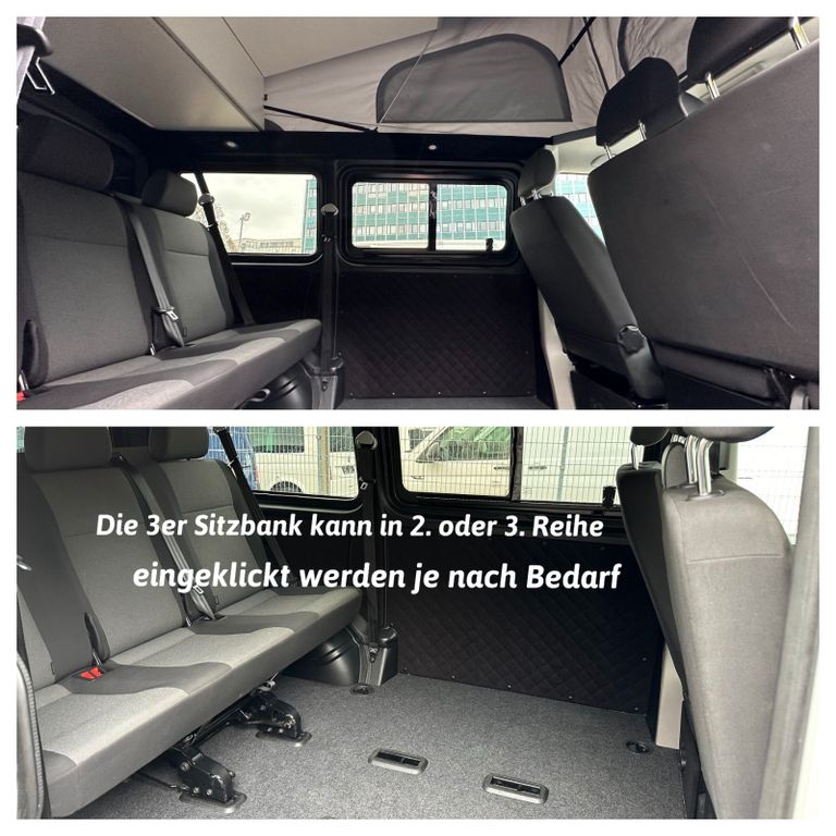 Die 3er Sitzbank (auch umklappbar) läßt sich mit einfachen Handgriffen beliebig ein- oder ausbauen sowie in 2. oder 3.Reihe versetzen. Je nachdem ob Sie viel Kofferraum brauchen oder im Camper übernachten wollen. Zusätzlich kann noch ein Einzelsitz in der 2.Reihe links oder rechts installiert werden.
