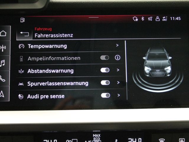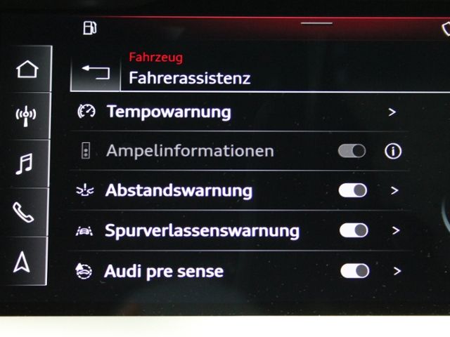 Spurverlassenswarnung; Geschwindigkeits-Begrenzeranlage; Ausweichassistent und Abbiegeassistent; Einparkhilfe hinten; Licht- / Regensensor; Audi pre sense front; Audi connect Notruf & Service mit Audi connect Remote & Control; Audi drive select ECO-Funktion