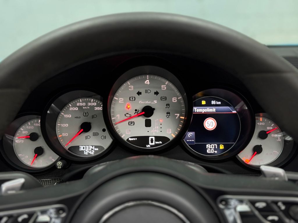 Aero-Kit Turbo, Anzeigeinstrumente mit farbigem Hintergrund, Außenspiegel Oberschale Carbon (Sport Design), Einstiegsblenden (Carbon) beleuchtet, Fahrassistenz-System: Park-Assistent vorn und hinten inkl. Rückfahrkamera, Fahrassistenz-System: Spurwechselassistent, Fahrassistenz-System: Verkehrszeichenerkennung, Fußmatten, Hauptscheinwerfer LED, schwarz, inkl. Porsche Dynamic Light System Plus (PDLS+), Heckleuchten LED, abgedunkelt, Innenausstattung: Luftdüsen lackiert, Innenraumlicht-Paket / Licht-Design-Paket, Interieur-Zusatzpaket: Fond Leder, Interieur-Zusatzpaket: Sportsitze Plus - Rückenlehnen Leder, Kopfstützen vorn mit Porschewappen, Lenkrad (GT Sport - Alcantara / Race-Tex) mit Schaltfunktion, Liftsystem Vorderachse, Mittelkonsole, Deckel Ablagefach hinten Alcantara mit Porschewappen, Modellbezeichnung auf den Türen, Raucher-Paket, Schalt-/Wählhebelgriff Alcantara / Race-Tex, Schwellerabdeckung / -verkleidung Wagenfarbe, Sicherheitsgurte farbig, Sitzbezug / Polsterung: Leder / Alcantara, Sitzheizung vorn, Sonderlackierung, Sonnenblenden Alcantara, Vehicle-Tracking-System Plus (PVTS Plus), Ziffernblatt farbig, Sport Chrono Stoppuhr