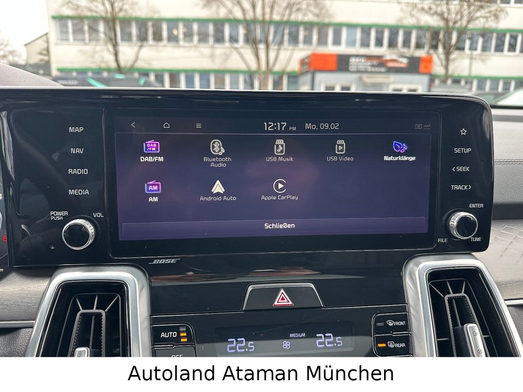 Adaptive Geschwindigkeits-Regelanlage mit Stop&Go-Funktion, Airbag Fahrer-/Beifahrerseite, Ambiente-Beleuchtung einstellbar, Anhänger-Stabilisierungs-Programm (TSA), Audio-Navigationssystem KIA (10,25"), Außenspiegel elektr. anklappbar, Außenspiegel elektr. verstell- und heizbar, beide, Außenspiegel Wagenfarbe, Bi-LED-Scheinwerfer, Blinkleuchte in Außenspiegel integriert, DAB-Tuner (Radioempfang digital), Dachreling, Einparkhilfe hinten, Einparkhilfe vorn, Einschaltautomatik für Fahrlicht, Fahrassistenz-System: aktiver Spurhalteassistent (LKAS, Lane Keep Assist System), Fahrassistenz-System: aktiver Totwinkel-Assistent (BCA-R), Fahrassistenz-System: Ausstiegswarnung (Safe Exit Warning, SEW), Fahrassistenz-System: Autobahnassistent (Highway Driving Assist, HDA), Fahrassistenz-System: Autonome Notbremsfunktion inkl. Frontkollisionswarnung (FCA 2.0), Fahrassistenz-System: Bergabfahr-Assistent, Fahrassistenz-System: Berganfahr-Assistent, Fahrassistenz-System: Fernlichtassistent, Fahrassistenz-System: Heckaufprall-Vermeidung (Prävention Heckkollision), Fahrassistenz-System: Insassenalarm (Rear Occopant Alert, ROA), Fahrassistenz-System: Multikollisionsbremse (Multi Collision Brake), Fahrassistenz-System: Müdigkeitserkennungs-Sensor (Driver Attention Warning, DAW), Fahrassistenz-System: Querverkehrs-Assistent (Rear Cross Traffic Collision Warning, RCCW), Fahrassistenz-System: Querverkehrs-Assistent mit Notbremsfunktion (RCCA), Fahrassistenz-System: Remote Parklenkassistent (Remote Smart Parking Assist, RSPA), Fahrassistenz-System: Sicherheitssystem mit automatischem Notruf (ERA GLONASS / eCall), Fahrassistenz-System: Stauassistent, Fensterheber elektr. mit Einklemmschutz hinten, Fensterheber elektrisch vorn + hinten, Freisprecheinrichtung (Bluetooth) mit Sprachsteuerung, Frontscheibe Solar-Reflect, Fußmatten, Gegenlenkunterstützung (Vehicle Stability Management, VSM), Getriebe 8-Gang - Doppelkupplungsgetriebe DCT, Head-up-Display (Frontsichtanzeige), Heckklappenöffnung elektr., Heckleuchten LED, Induktionsladeschale für Smartphone, Innenspiegel mit Abblendautomatik, Intelligenter Geschwindigkeits-Begrenzer, Isofix-Aufnahmen für Kindersitz, Kamerasystem Around View, Karosserie: 5-türig, Klimaautomatik 2-Zonen, Kombiinstrument digital, Kopf-Airbag-System vorn und hinten, Kühlergrill Klavierlack, Lendenwirbelstütze Sitz vorn links, elektr. verstellbar, Lenkrad (Kunstleder), Lenkrad heizbar, Lenkrad mit Multifunktion, Lenkrad mit Schaltwippen, Lenksäule (Lenkrad) höhen-/längsverstellbar, Mittelarmlehne hinten mit Getränkehalter, Mittelarmlehne vorn mit Staufach, Mobile Online Dienste UVO Connect / Kia Connect, Motor 2,2 Ltr. - 148 kW CRDi KAT, Nebelscheinwerfer LED, Niveauregulierung der Hinterachse, Parkbremse elektrisch, Pedale Aluminium, Radstand 2815 mm, Reifendruck-Kontrollsystem, Schadstoffarm nach Abgasnorm Euro 6d, Seitenairbag, Seitenscheiben Solar-Reflect, Sitz vorn links elektr. verstellbar (mit Memory), Sitz vorn links höhenverstellbar, Sitz vorn rechts elektr. verstellbar, Sitzbelüftung vorn, Sitzbezug / Polsterung: Leder Nappa, Sitzheizung vorn, Smartphone Schnittstelle (Apple CarPlay & Android Auto), Sonnenschutzrollo an Türscheiben hinten, Sound-System Bose, Türgriffe außen verchromt, Unterfahrschutz hinten, Unterfahrschutz vorn, Verglasung hinten abgedunkelt (Privacy Glass)